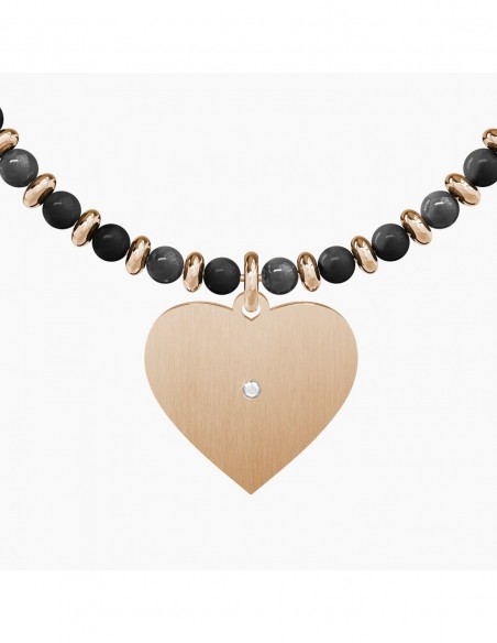 Bangle con filo armonico in acciaio, sfere sfaccettate in labradorite grigia e ciondolo satinato a cuore color oro rosa.