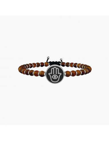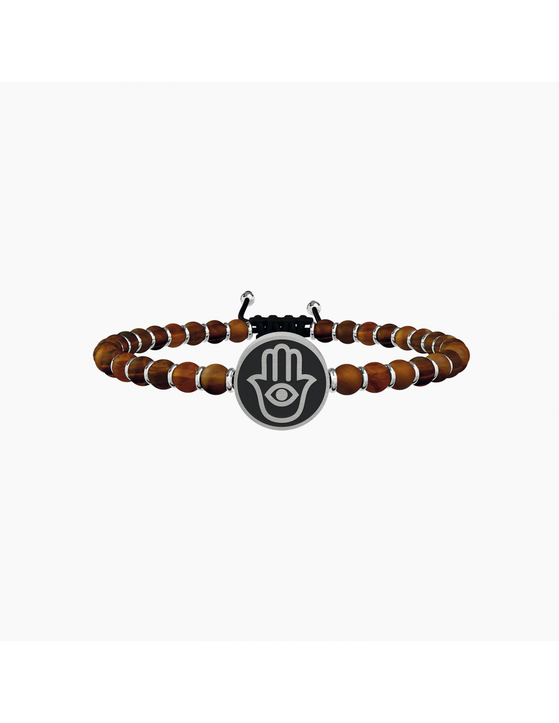Bracciale con sfere in occhio di tigre e piastra tonda Mano di Fatima in acciaio di colore nero.