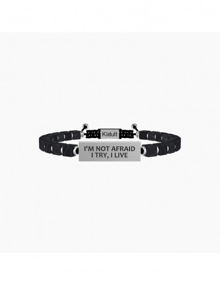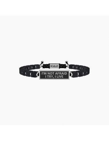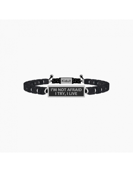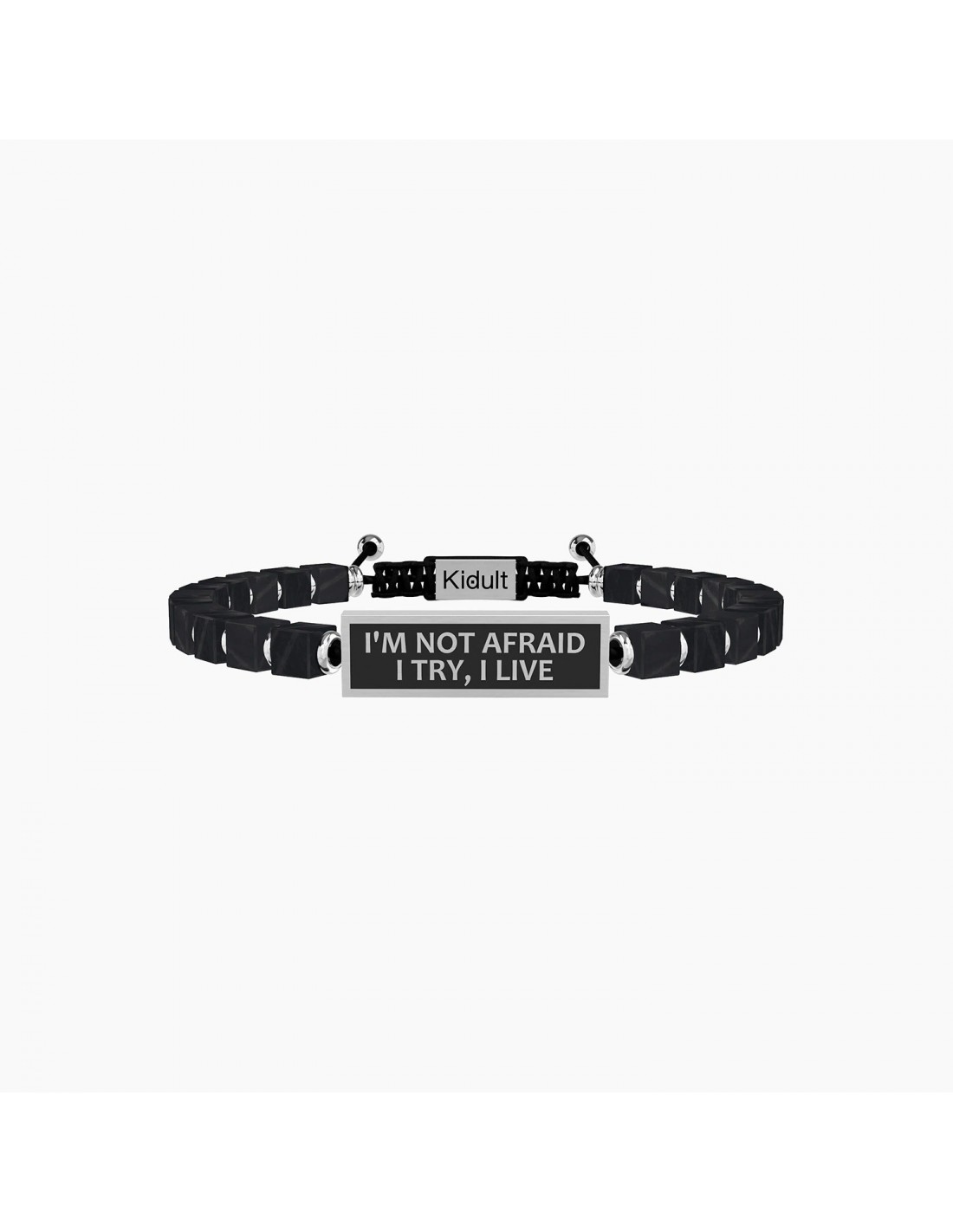 I'm not afraid I try, I live Bracciale con cubi in onice e piastra rettangolare in acciaio di colore nero.