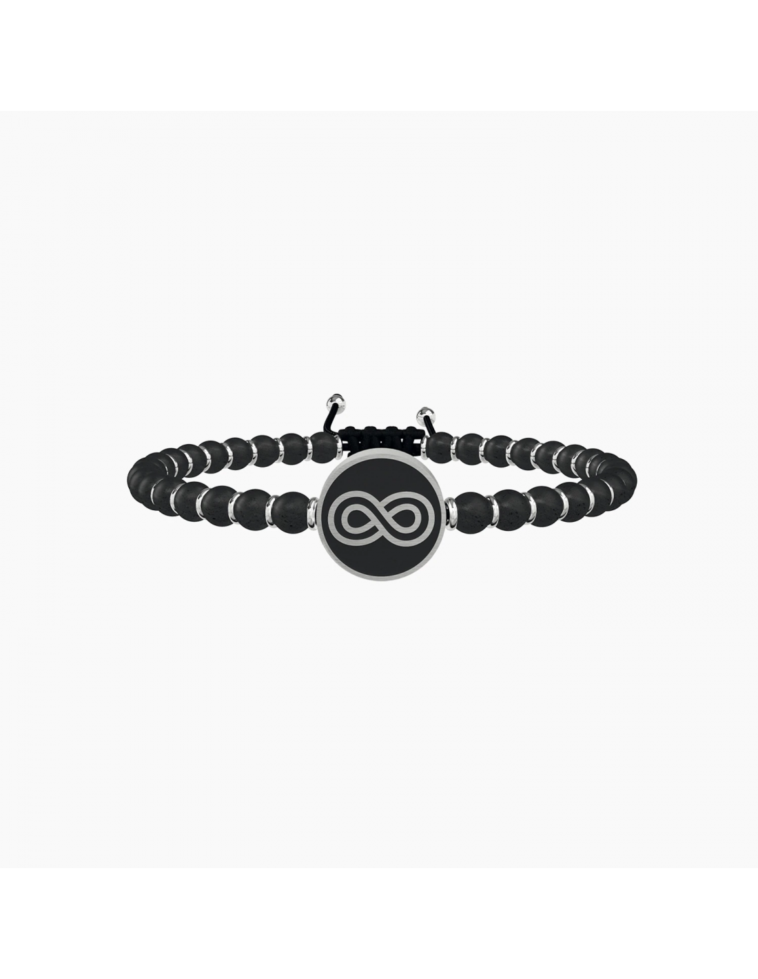 Bracciale con sfere in onice e piastra tonda Infinito in acciaio di colore nero.