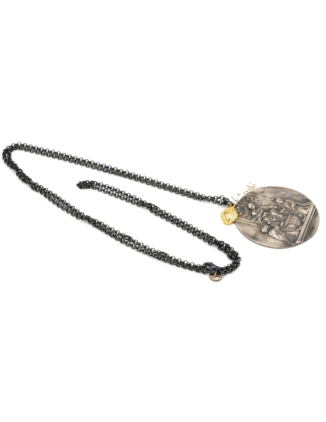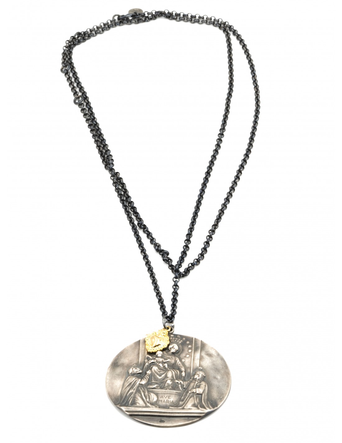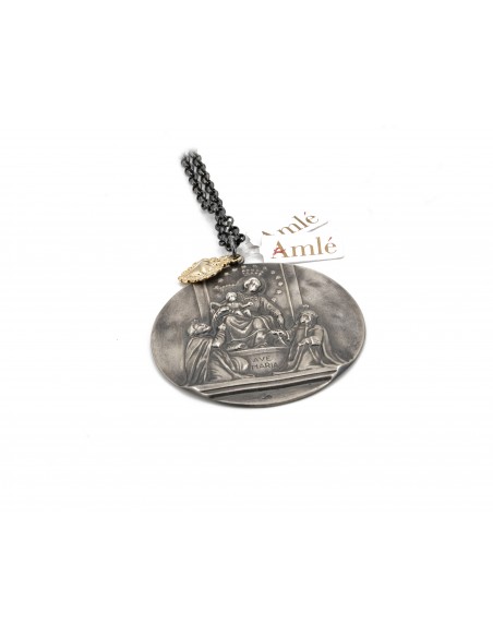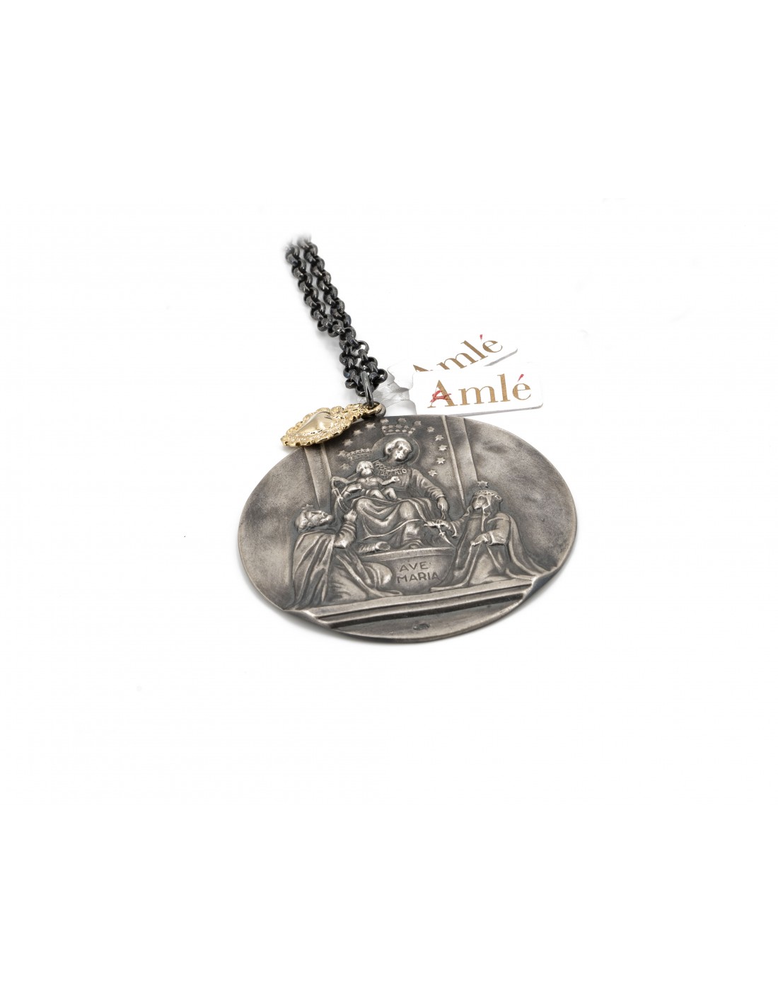 Collana Amlè con Medaglione Religioso Ave Maria in Argento Brunito e Piccolo Cuore Sacro Dorato. Lunghezza totale monogiro: 59cm.