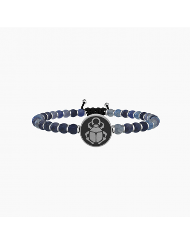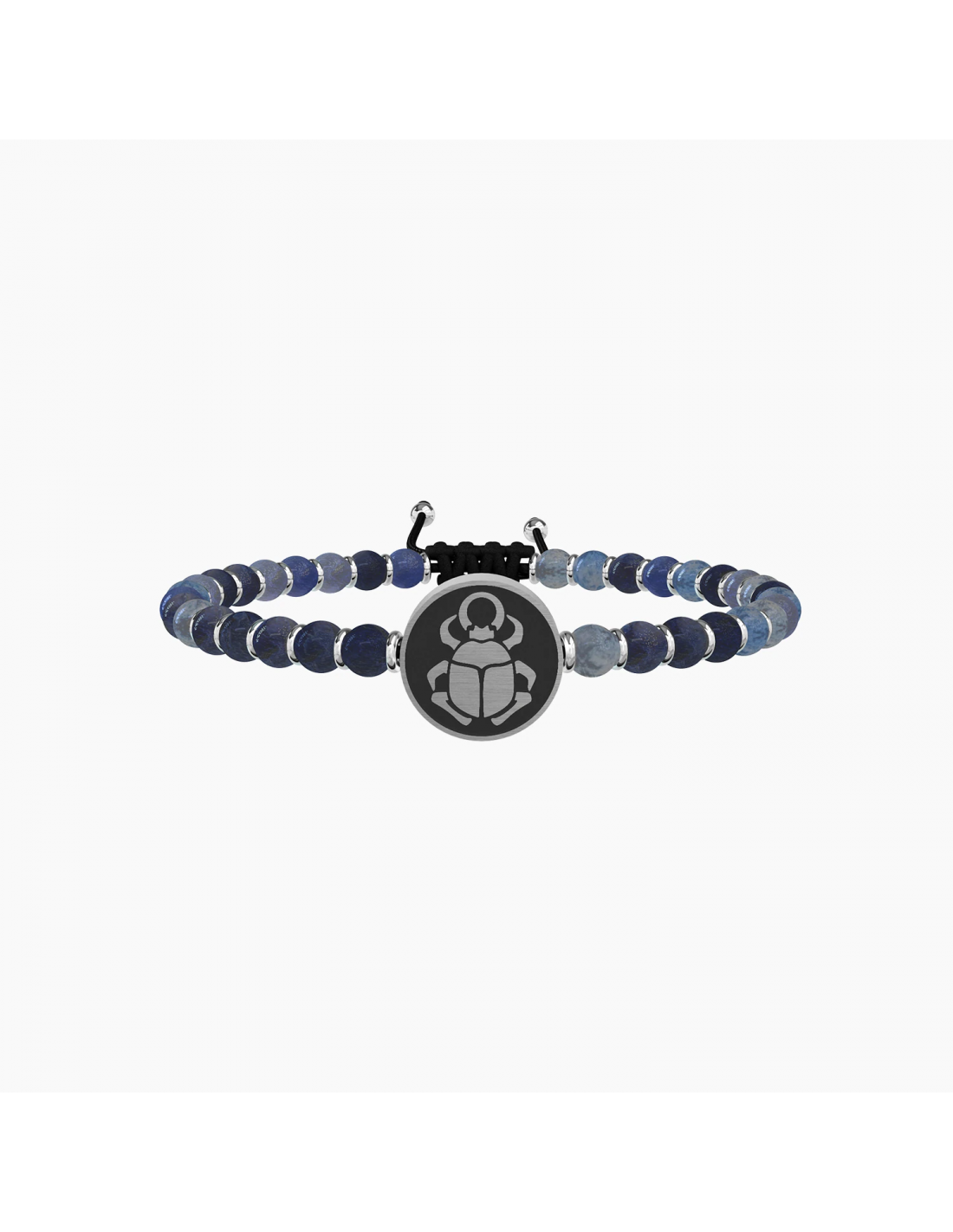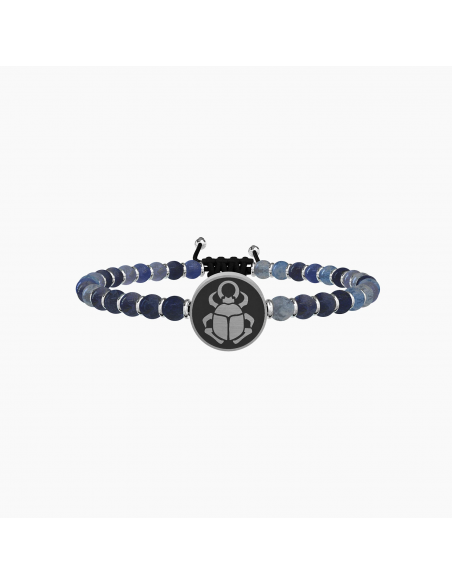 Bracciale con sfere in sodalite e piastra tondaScarabeo in acciaio colore nero.