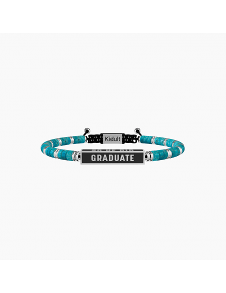 Bracciale con anelli in turchese e parallelepipedo in acciaio di colore nero.