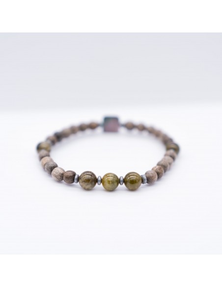 Bracciale da uomo realizzato in legno, ematite e granato verde.