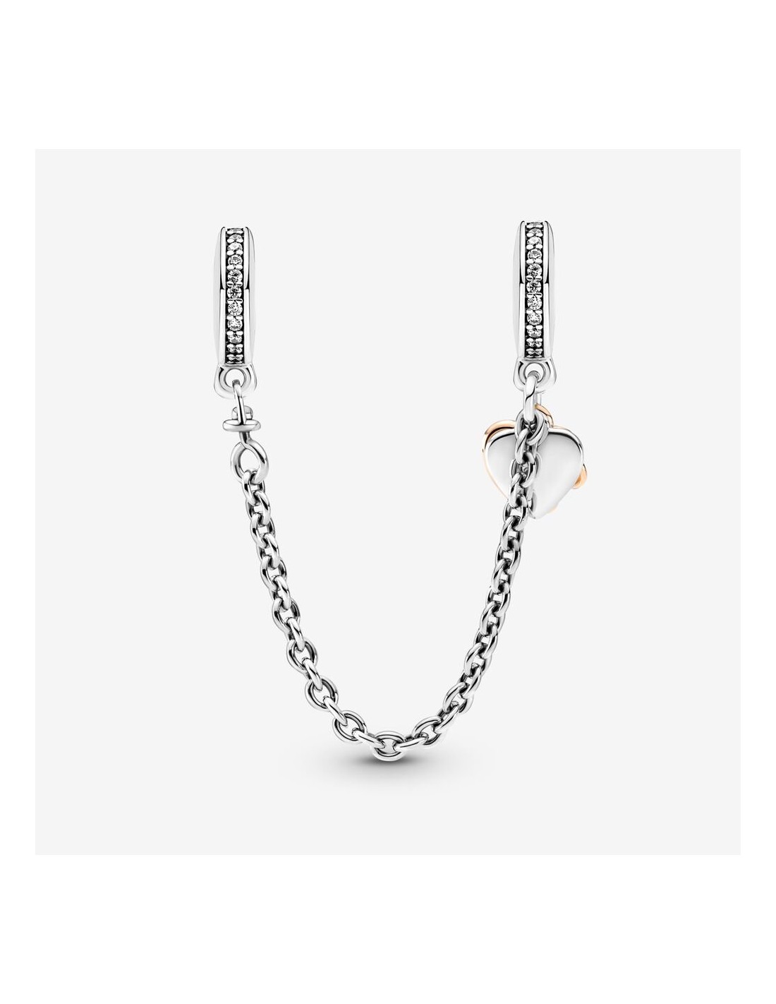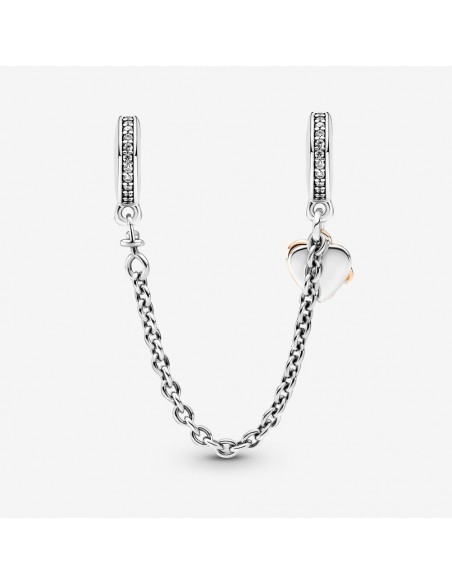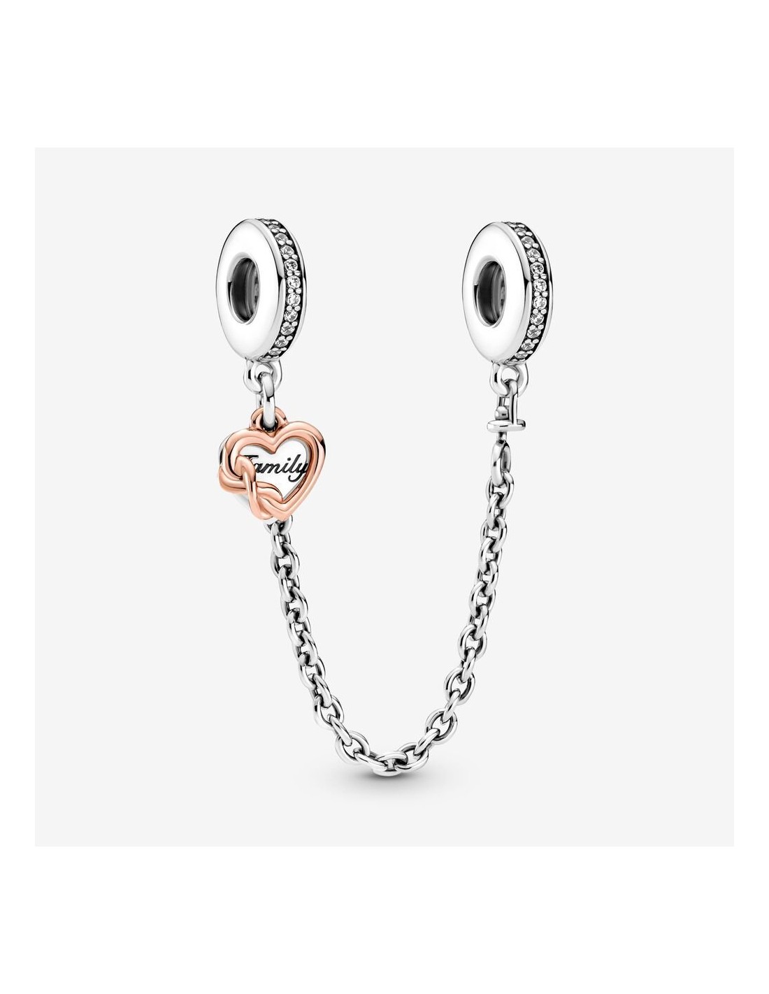 Tieni al sicuro i tuoi charm con stile ed eleganza con la catena di sicurezza Cuore e famiglia. La catena di sicurezza bicolore è rifinita a mano e realizzata in Argento Sterling 925 e metallo con placcatura in Oro rosa 14K. Il gioiello presenta due cuori pendenti, uno aperto sui toni caldi decorato da un simbolo dell’infinito e un secondo disco a forma di cuore in Argento Sterling 925 che reca l’incisione “Family” nella parte anteriore. Le estremità sono caratterizzate da una clip che include una fila di pietre di zirconia cubica incolori che completano il look aggiungendo ulteriore splendore.