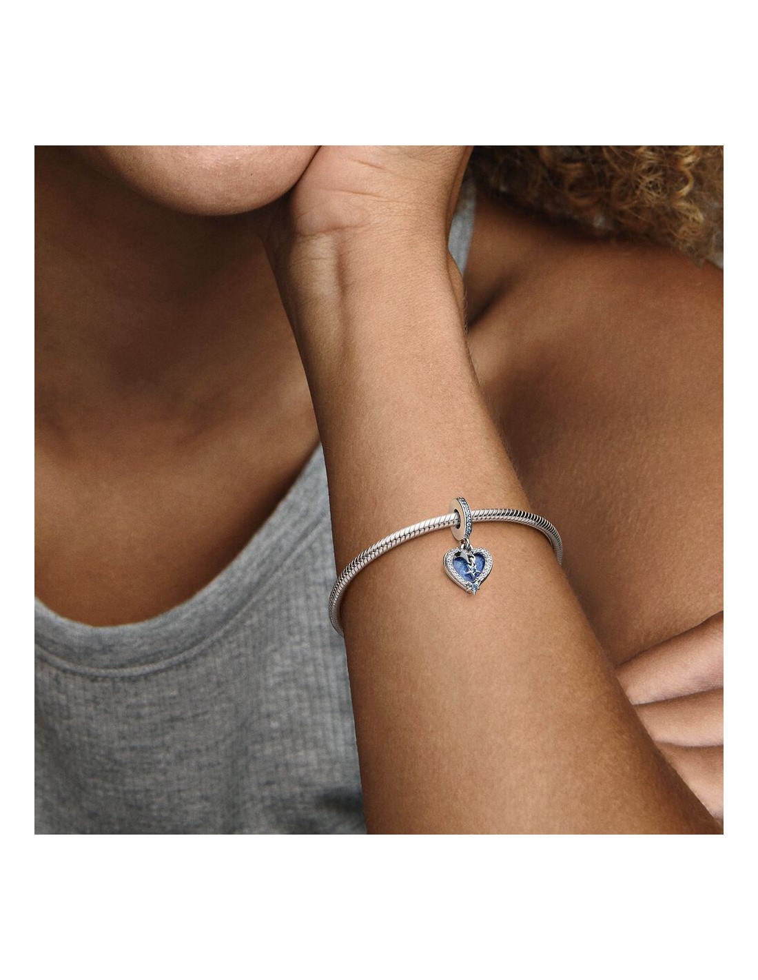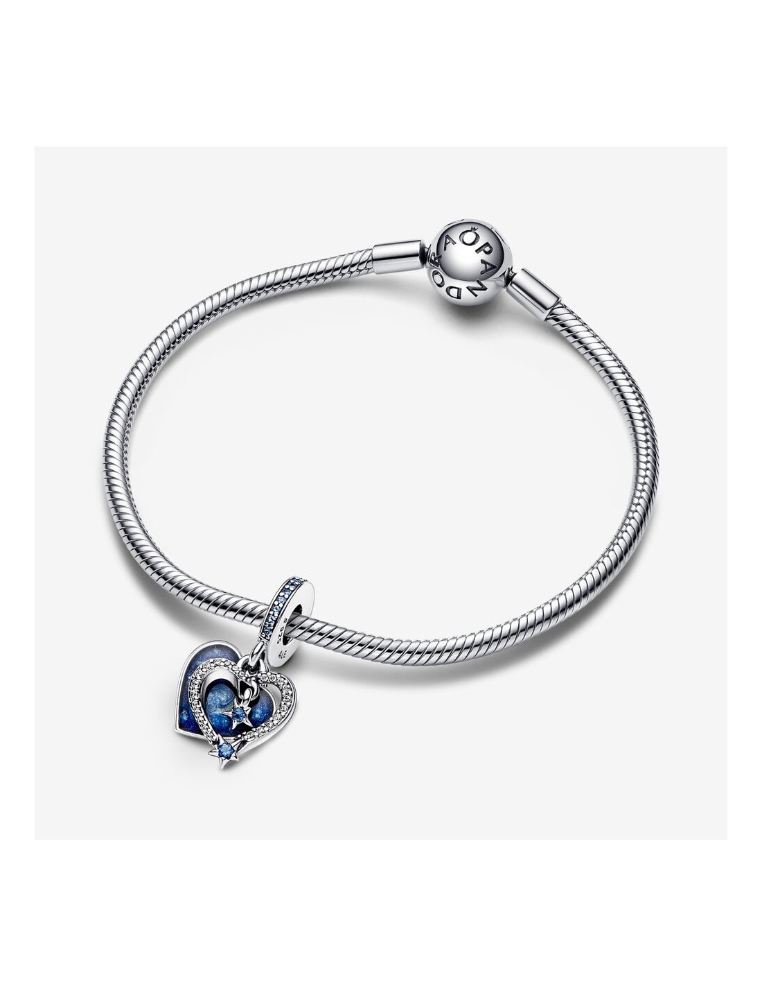 Due stelle cadenti si uniscono per formare il contorno di un cuore in questo romantico charm pendente doppio, realizzato in Argento Sterling 925. Ogni stella è decorata da un cristallo blu creato dall'uomo, mentre la coda presenta un pavé di pietre di zirconia cubica incolore. Dietro le stelle, una galassia con effetto a vortice si mostra attraverso la parte posteriore del pendente, creato con smalto scintillante in diverse sfumature di blu. Il retro della parte smaltata reca inciso il messaggio "I fall in love with you every day" (Mi innamoro di te ogni giorno). Cattura la magia del cielo notturno e regala questo gioiello alla persona che ami.