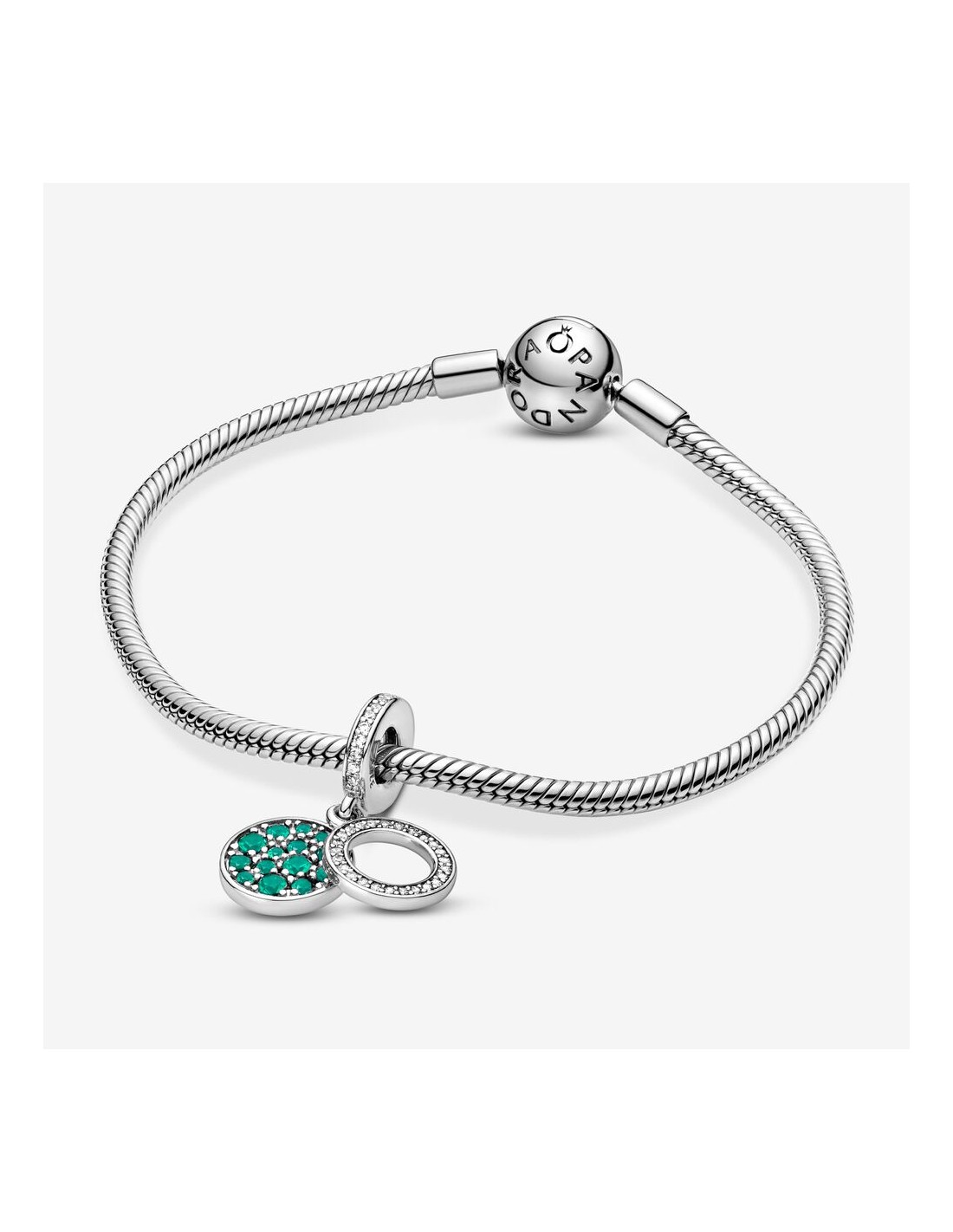 Aggiungi un tocco di colore alla tua collezione con questo charm pendente doppio con disco verde scintillante. Rifinito a mano e realizzato in Argento Sterling 925, il gioiello include un disco posteriore decorato da sfere e pietre verdi di diverse dimensioni. Il logo Pandora e il monogramma della O coronata ornano l’altro lato del disco. Il cerchio davanti sfoggia pietre di zirconia cubica incolori a contrasto. Abbina il gioiello ad altri charm colorati per rendere ancora più raffinato il tuo bracciale Pandora Moments.