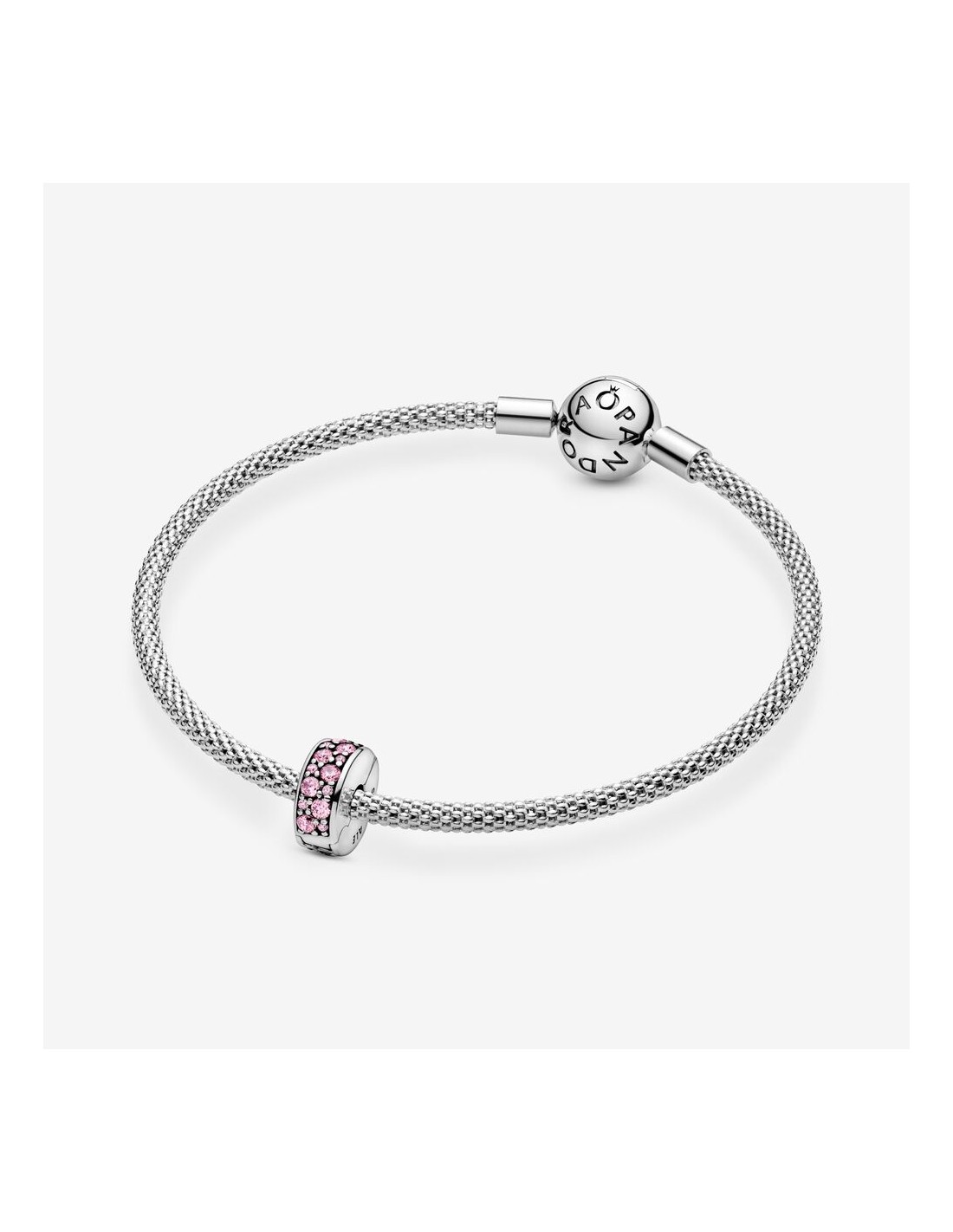Aggiungi un tocco di rosa al tuo look con questa clip rifinita a mano, decorata con pavé di pietre di zirconia cubica incastonate a mano. Creato per essere indossato sui bracciali Pandora Moments, la clip in Argento Sterling 925 infonde equilibrio e aggiunge simmetria al tuo look. E l’inserto in silicone nascosto lo mantiene perfettamente in posizione. La clip è completata da un inserto in silicone e non può essere inserita sulle filettature (ovvero sui divisori in rilievo). ma è inseribile in qualsiasi altro punto del bracciale.