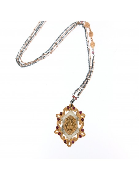 Collana Sacramore con pendente cornice rubini doppia catena e Madonnine. Realizzata in argento 925°%, è un capolavoro artigianale, qui si vede la lavorazione dei sapienti artigiani che assemblano pietre preziose come i rubini all’argento lavorato in modo da far sembrare questo pendente un antico decoro barocco. Argento rosato e argento contrastano perfettamente tra di loro, riprendendo l’effetto della doppia catena, intervallata dalle pietre dure naturali tono su tono e dalle Madonnine inserite lungo la catena.