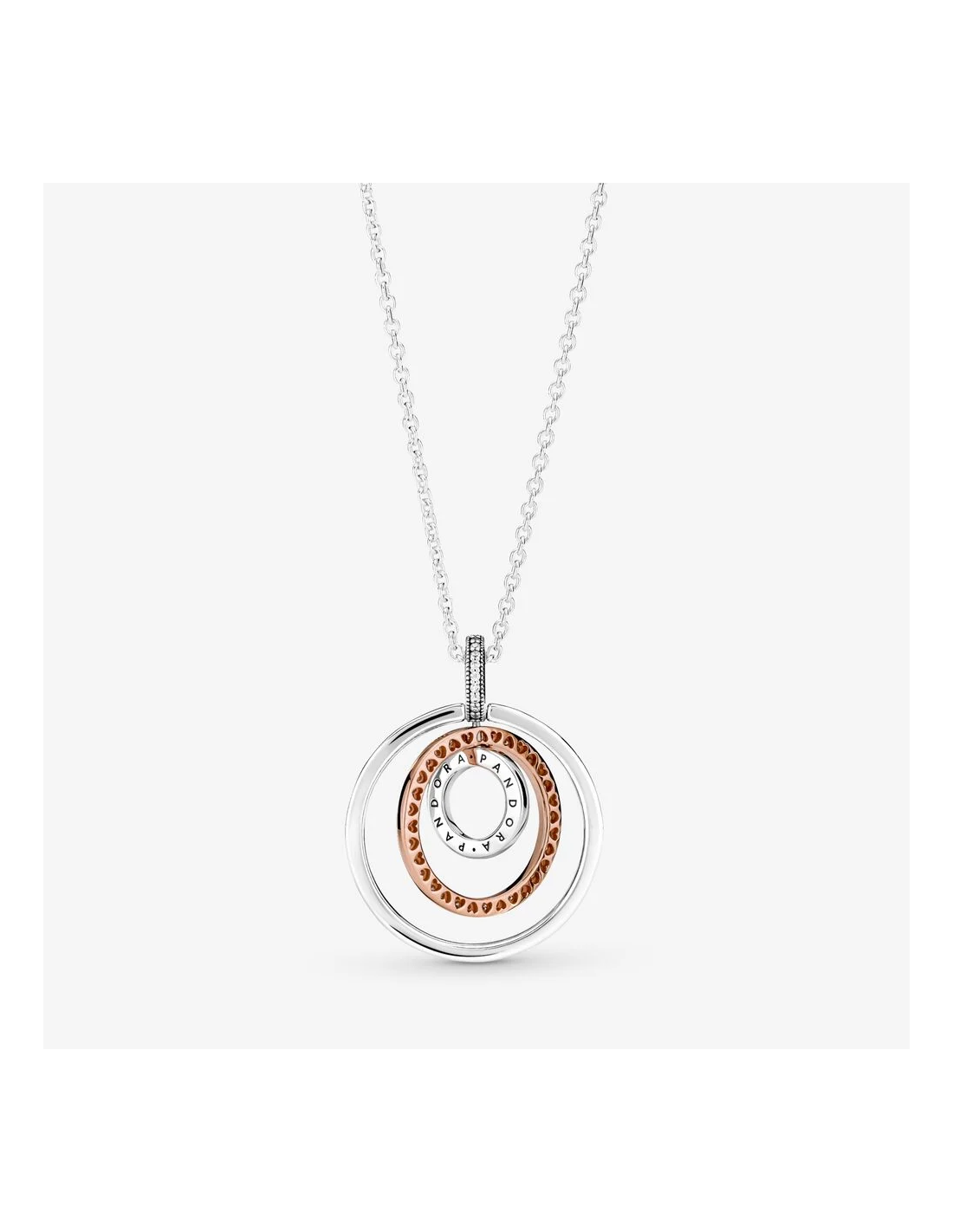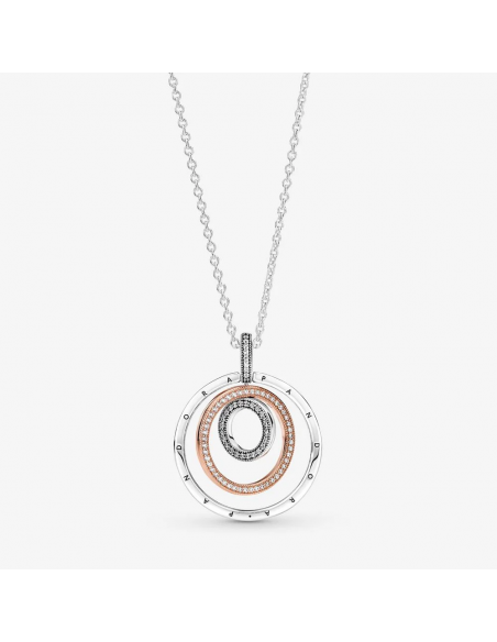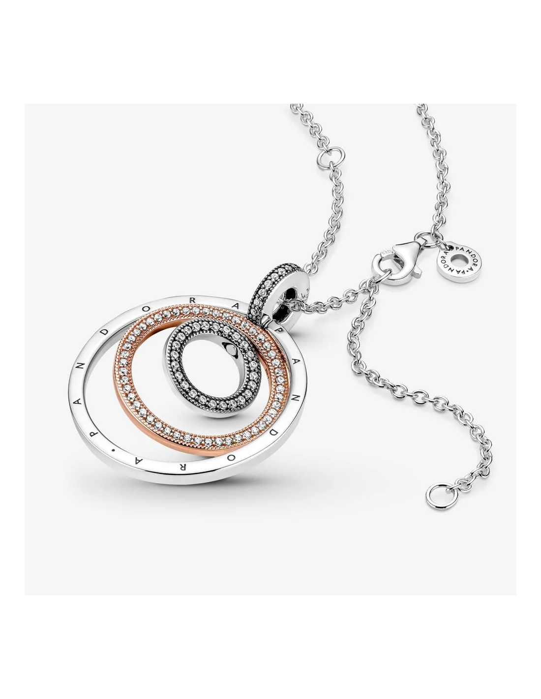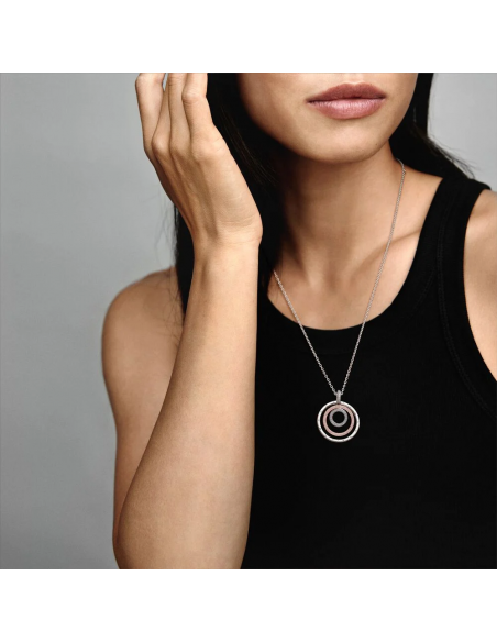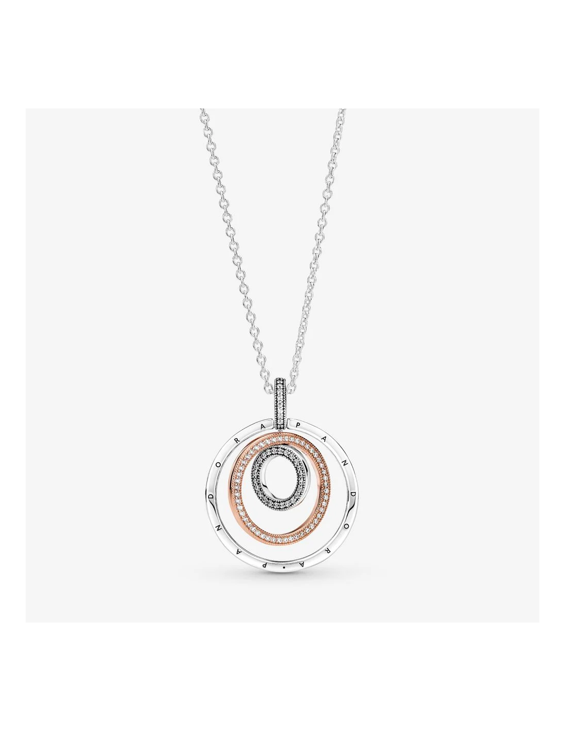 Punta sulle linee geometriche con la collana e pendente Cerchi bicolore. Rifinita a mano e realizzata in argento sterling 925 e con placcatura in oro rosa 14k, la collana è caratterizzata da tre cerchi girevoli. Il cerchio esterno include i loghi Pandora su un lato, mentre l’altro lato è lucido; il cerchio di mezzo con placcatura in oro rosa 14k presenta un pavé di pietre di zirconia cubica incolori incorniciato da micro-sfere da un lato e da cuori intagliati dall’altro; il cerchio centrale mostra un pavé incorniciato da micro-sfere su un lato e il logo Pandora sul retro. I cerchi possono essere girati creando otto diverse combinazioni di stile.