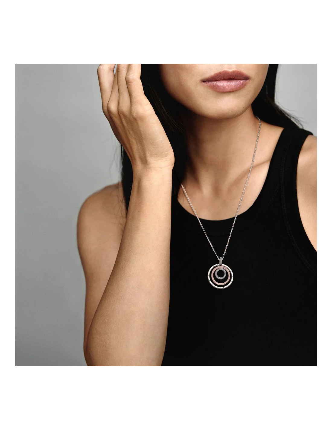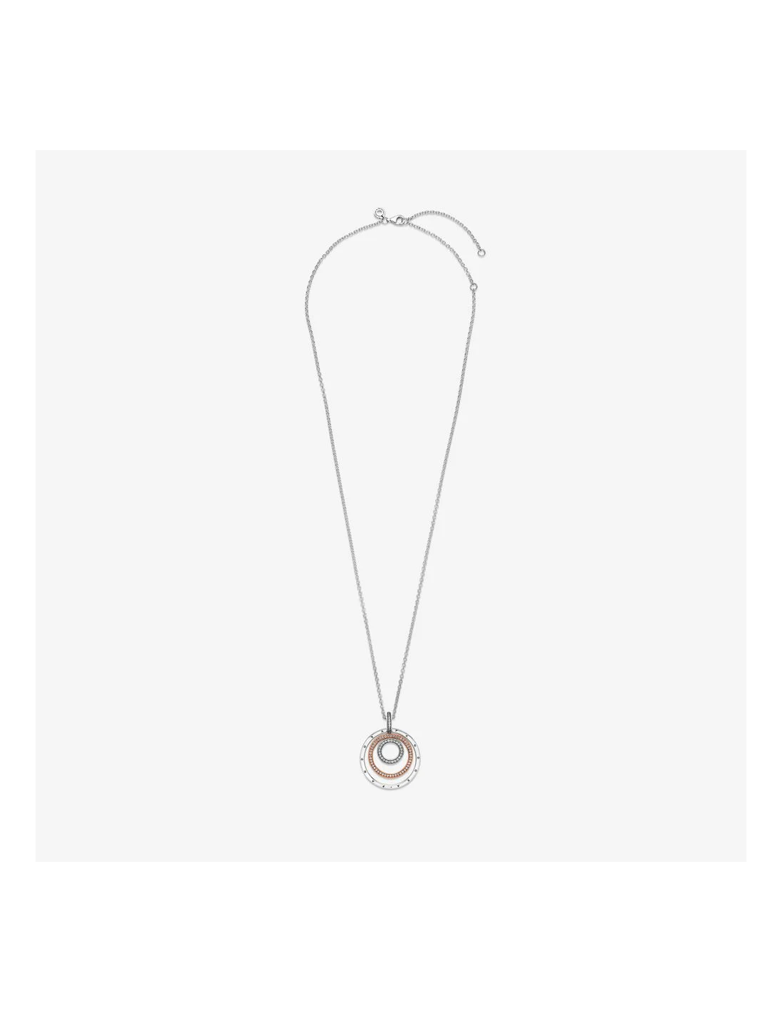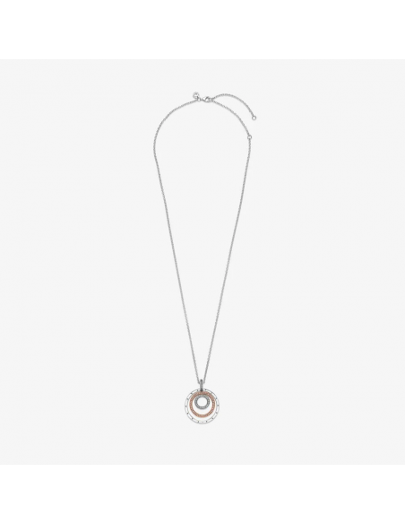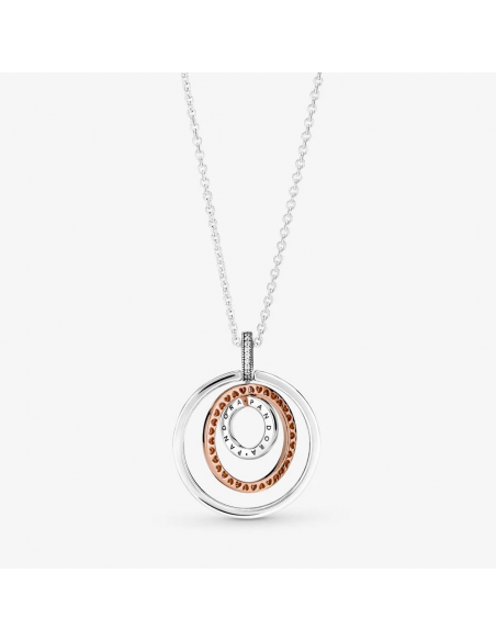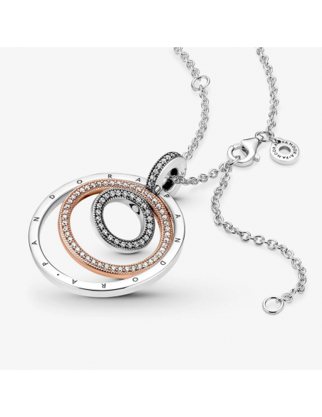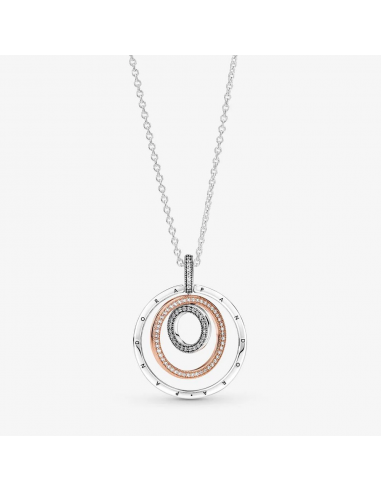 Punta sulle linee geometriche con la collana e pendente Cerchi bicolore. Rifinita a mano e realizzata in argento sterling 925 e con placcatura in oro rosa 14k, la collana è caratterizzata da tre cerchi girevoli. Il cerchio esterno include i loghi Pandora su un lato, mentre l’altro lato è lucido; il cerchio di mezzo con placcatura in oro rosa 14k presenta un pavé di pietre di zirconia cubica incolori incorniciato da micro-sfere da un lato e da cuori intagliati dall’altro; il cerchio centrale mostra un pavé incorniciato da micro-sfere su un lato e il logo Pandora sul retro. I cerchi possono essere girati creando otto diverse combinazioni di stile.