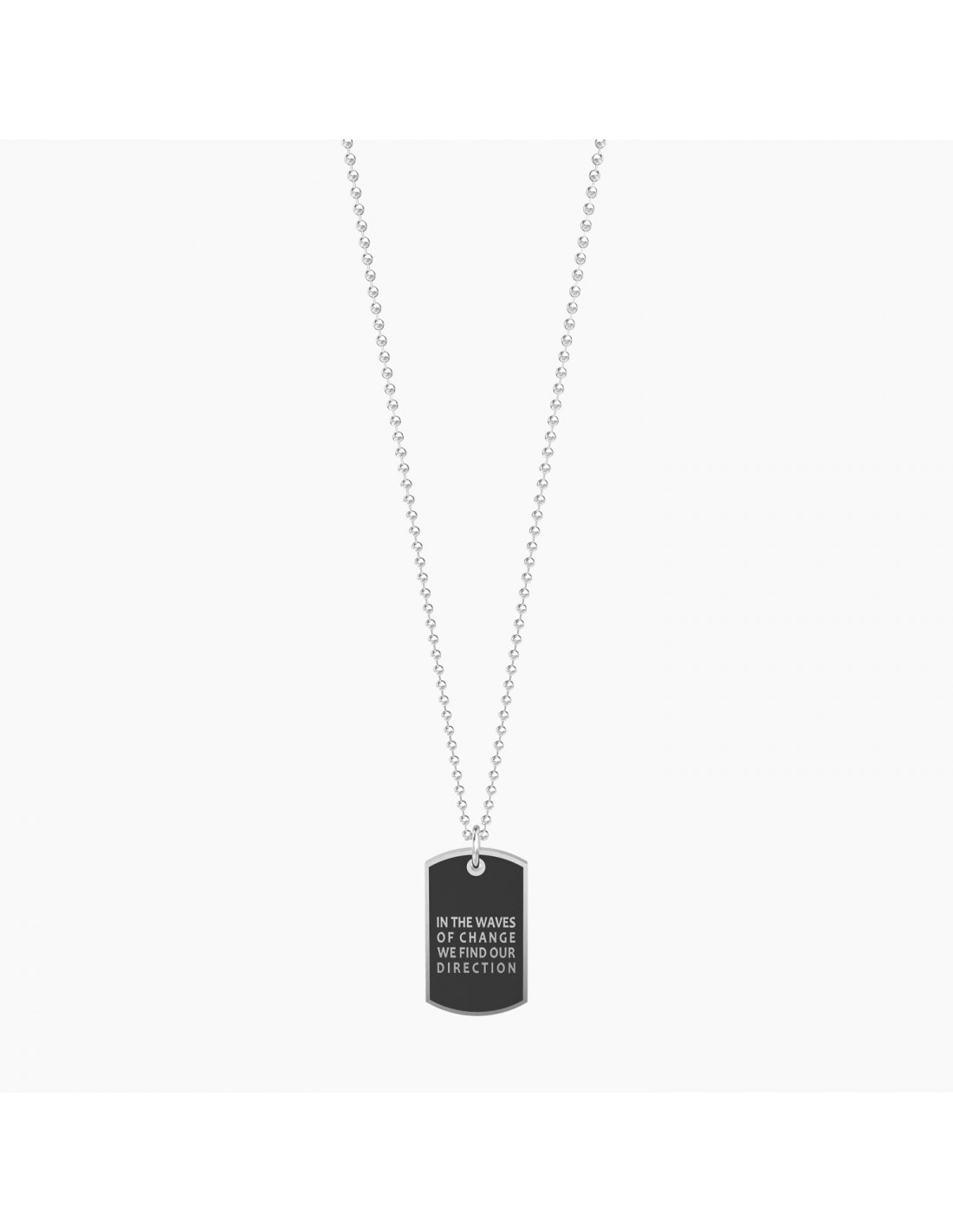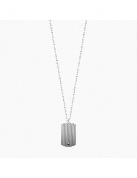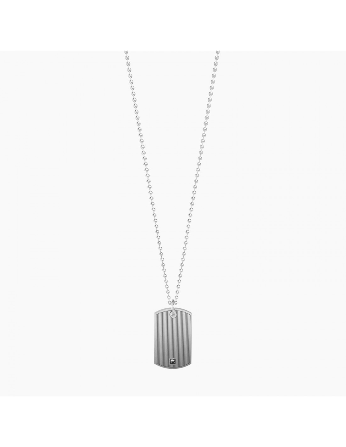 Collana lunga in acciaio con ciondolo satinato a piastrina e catena pallinata.