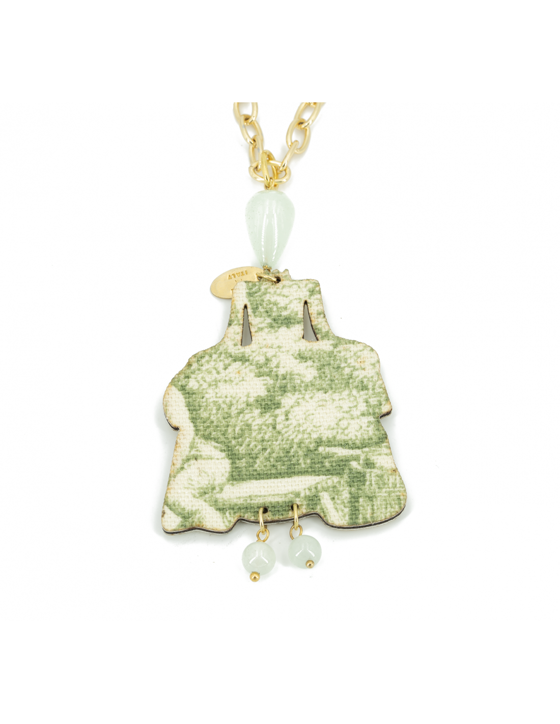 Catena in ottone galvanizzato oro lunga 70 cm con ciondolo in legno e tessuto. Lunghezza ciondolo 10 cm