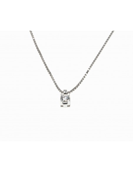 Collana da donna, puto luce, prodotta da Giorgio Visconti, referenza articolo GB37500D, realizzata in oro bianco 750%, con un diamante taglio brillante, 0.04 centesimi di carato, colore G selezionato, purezza VS, modello catenina veneziana, lunghezza catenina 45.50 centimetri, chiusura a moschettone, peso totale grammi 2.30