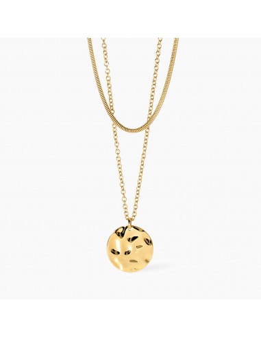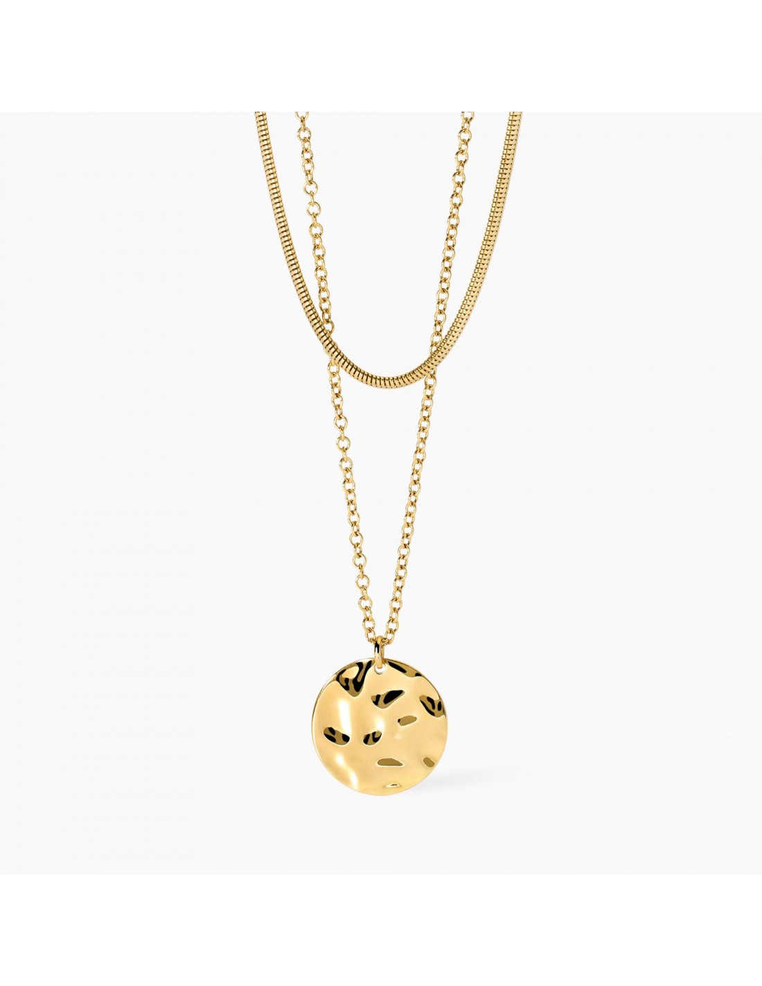 Girocollo regolabile in acciaio dorato con elemento tondo effetto martellato.