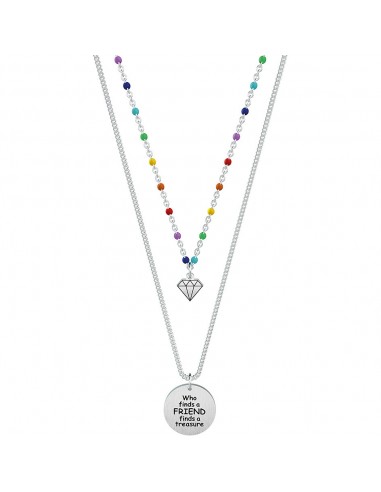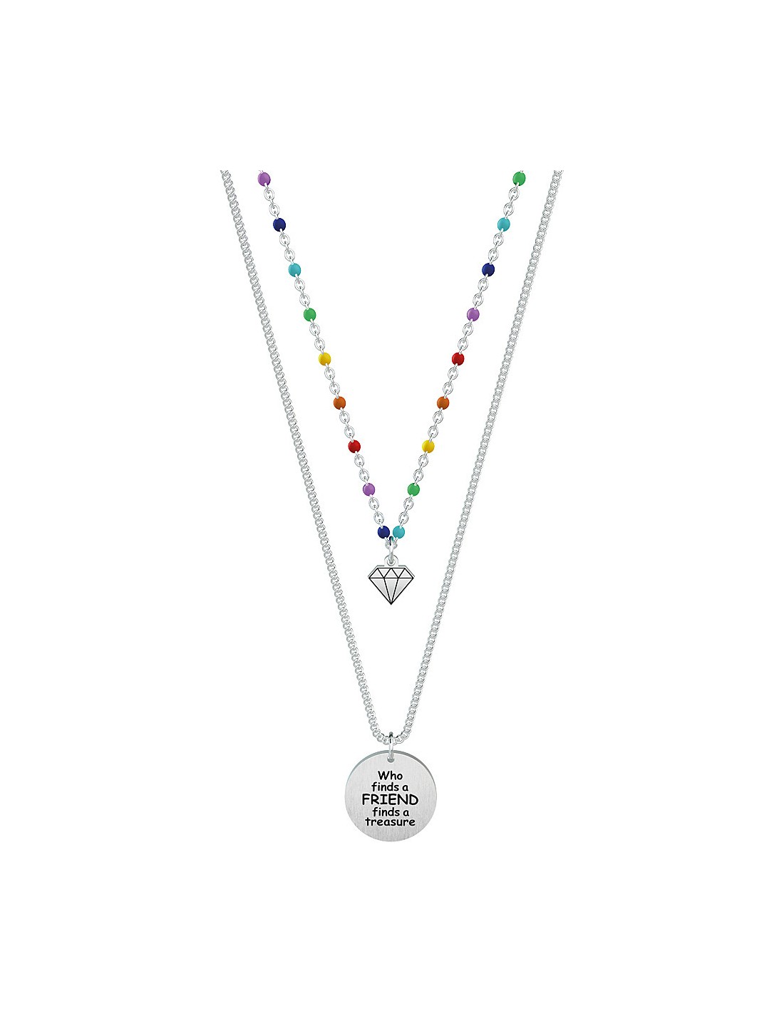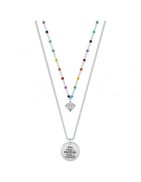 Ci siamo trovate per caso, ma da quel giorno non ci siamo pi lasciate. Non rinuncerei alla nostra amicizia per tutto l'oro del mondo, perchŽ non c' tesoro pi prezioso. Collana corta in acciaio con ciondoli satinato tondo e a forma di diamante, a due catene groumette e rol˜ con inserimenti in smalto multicolor.