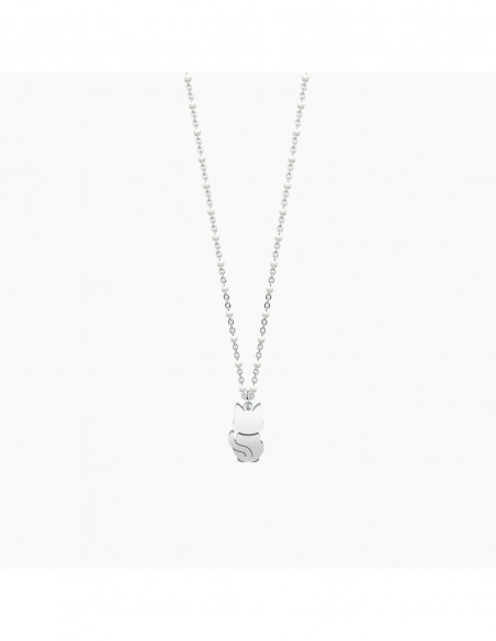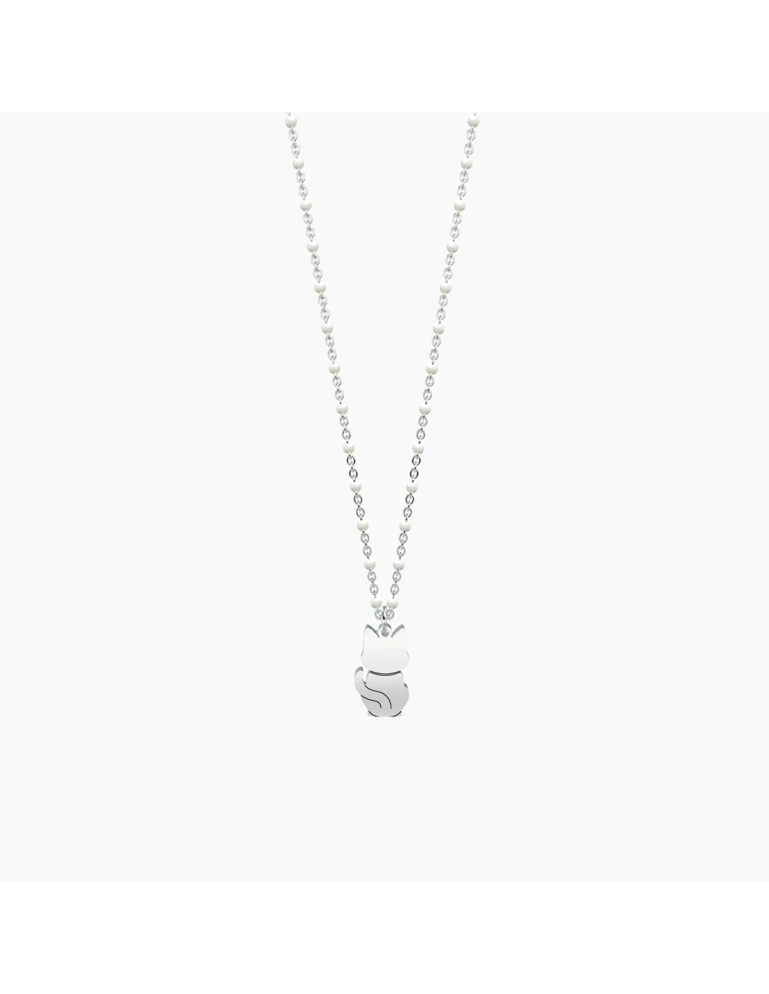 Hai bisogno di prenderti cura di qualcuno, giocare insieme a lui, stringerlo forte e dargli tante carezze? Beh, allora hai bisogno di un gatto! Collana corta in acciaio con ciondolo a gatto e catena rol˜ con inserimenti in smalto bianco.