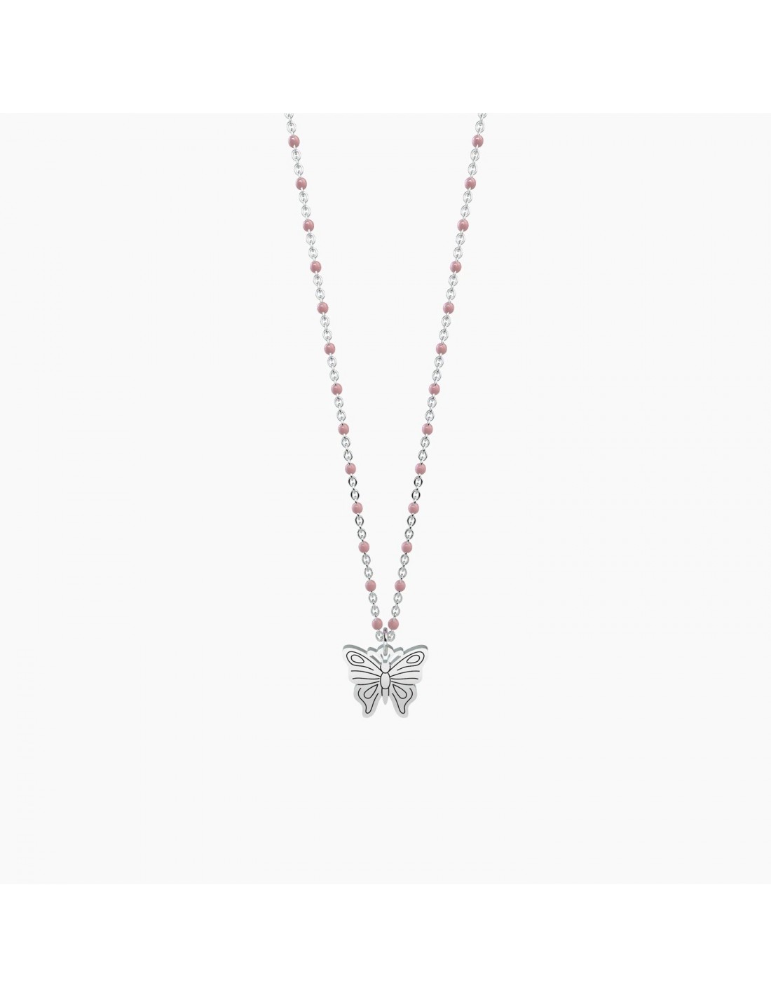 Ali leggere accarezzate dal vento, spirito libero che danza nel cielo con i colori dell'arcobaleno. Per lei ogni secondo vale come un giorno. Ti ricorderˆ di vivere intensamente ogni singolo momento. Collana corta in acciaio con ciondolo a farfalla e catena rol˜ con inserimenti in smalto rosa.