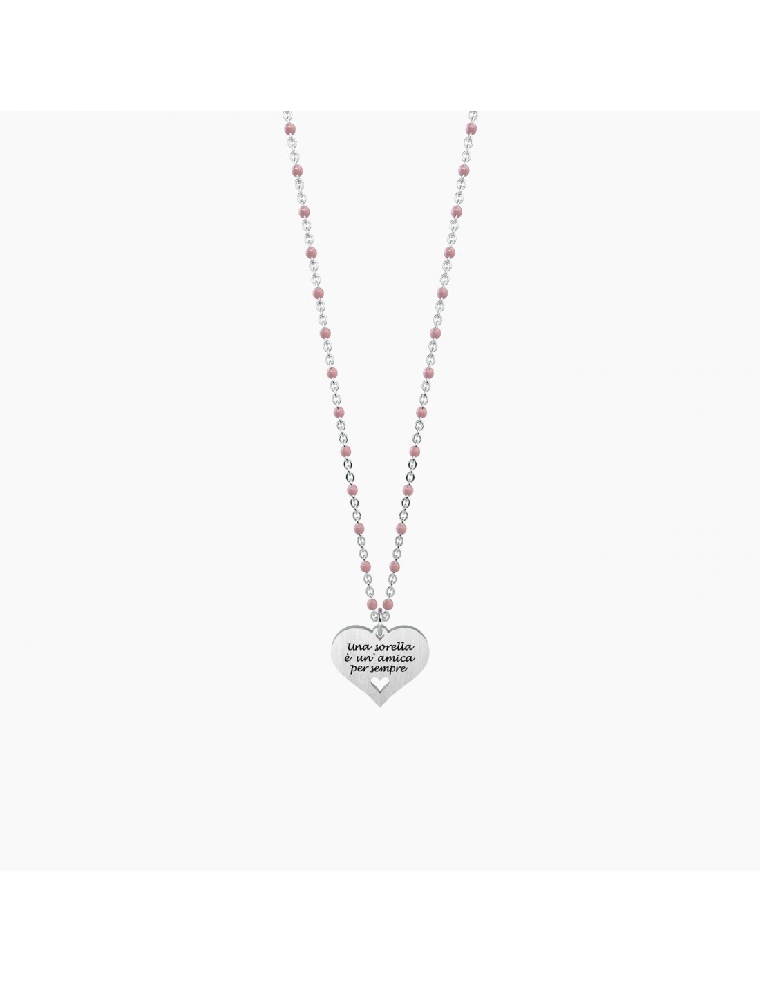 Una sorella  un'amica per sempre Collana corta in acciaio con ciondolo satinato a cuore e catena rol˜ con inserimenti in smalto rosa.