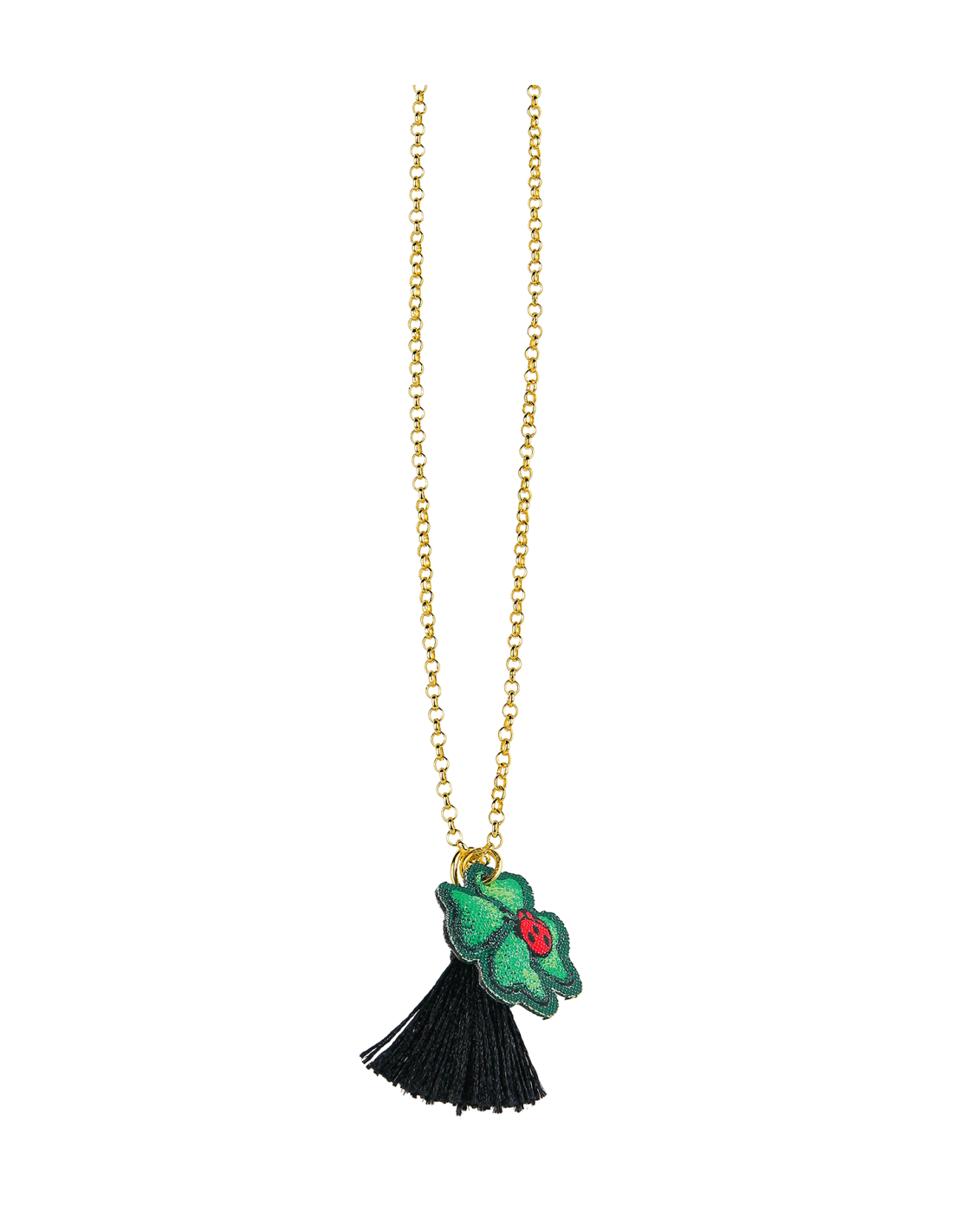 Collana in ottone galvanizzato oro, lunghezza 45 cm. Ciondolo ricamato a telaio e imbottito, lunghezza 3 cm.