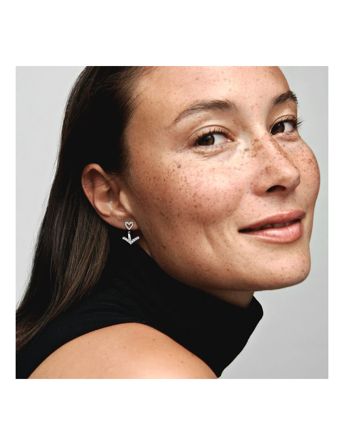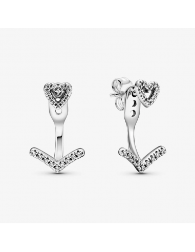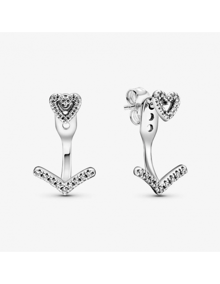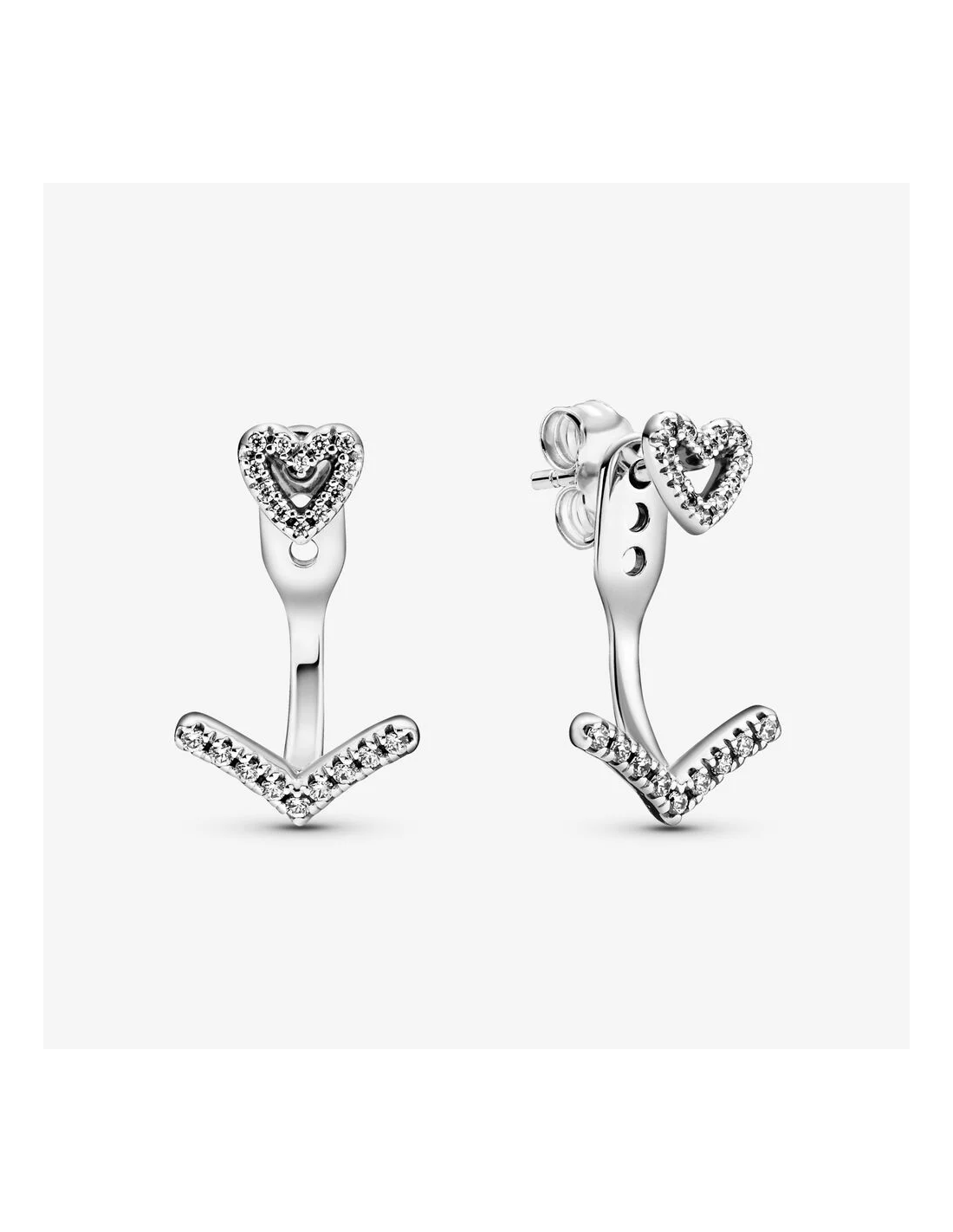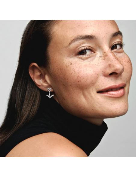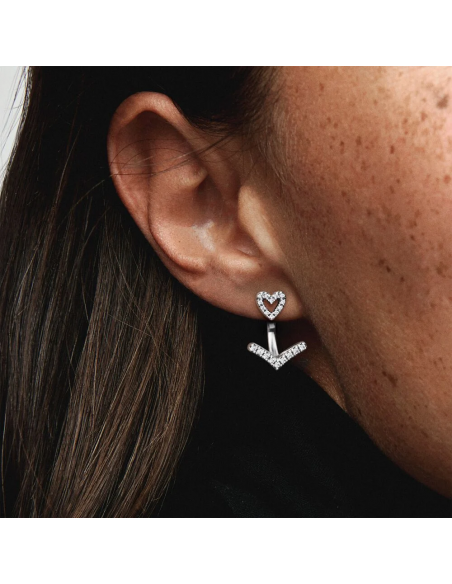 Ravviva il tuo look con questi orecchini a lobo con cuore chevron scintillanti. Rifiniti a mano e realizzati in Argento Sterling 925, i gioielli si ispirano agli elementi di design della collezione Pandora Wish. Gli orecchini a cuore e gli ear jacket staccabili a forma di V sono decorati da pietre incolori. L’altezza degli ear jacket può essere regolata. Indossa questi orecchini versatili con o senza gli ear jacket o vivacizza il tuo stile abbinandoli ad altri ear jacket Pandora.
