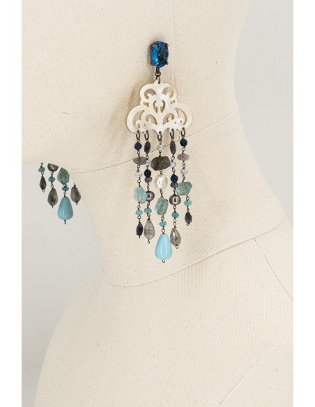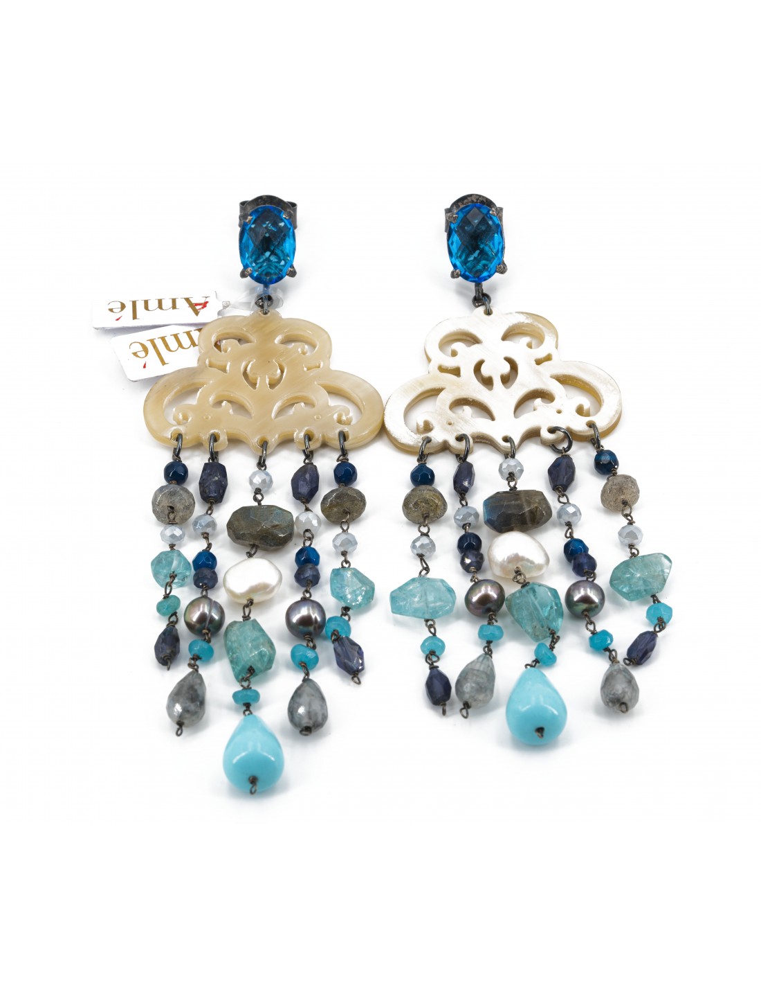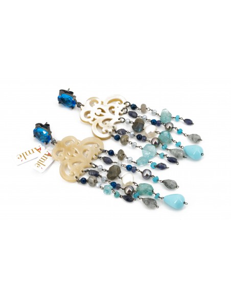 Orecchini Amlè in Argento Brunito (925), Corno Sfumato, Pietre e Perle Naturali. Tipo di chiusura a Perno con Farfallina.