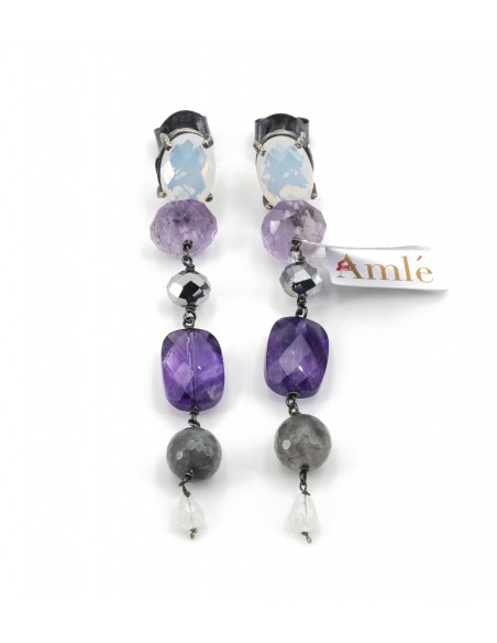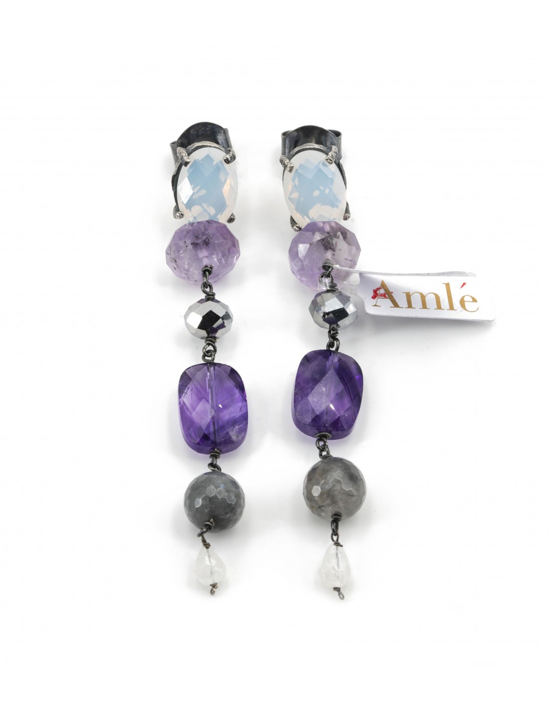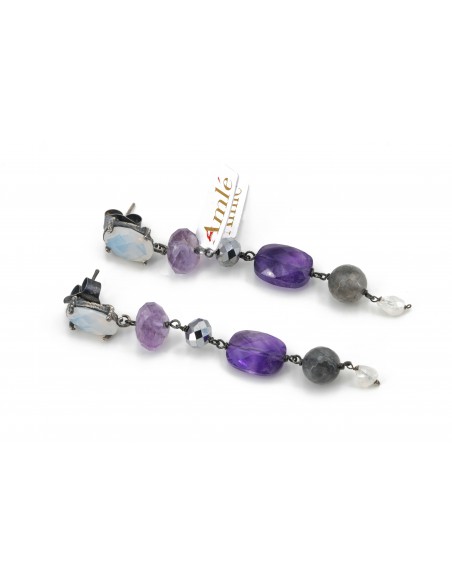 Orecchini Amlè in Argento Brunito (925) e Pietre Naturali ( Ametista, Ematite, Quarzo Bianco e Fumè ). Tipo di chiusura a Perno con Farfallina.
