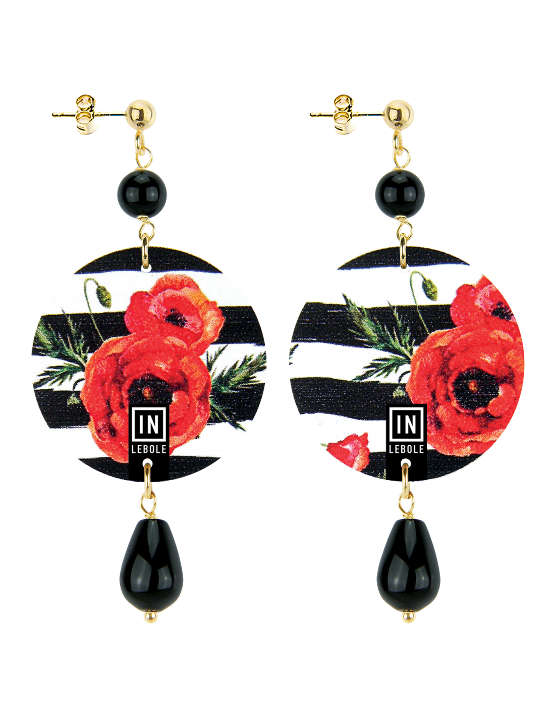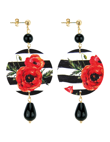 Gli orecchini della nuova collezione The Circle sono realizzati con capsule piatte stampate su banda stagnata, montati in ottone galvanizzato oro e pietre naturali. L’asimmetria è data dalle diverse immagini impresse nella capsula.