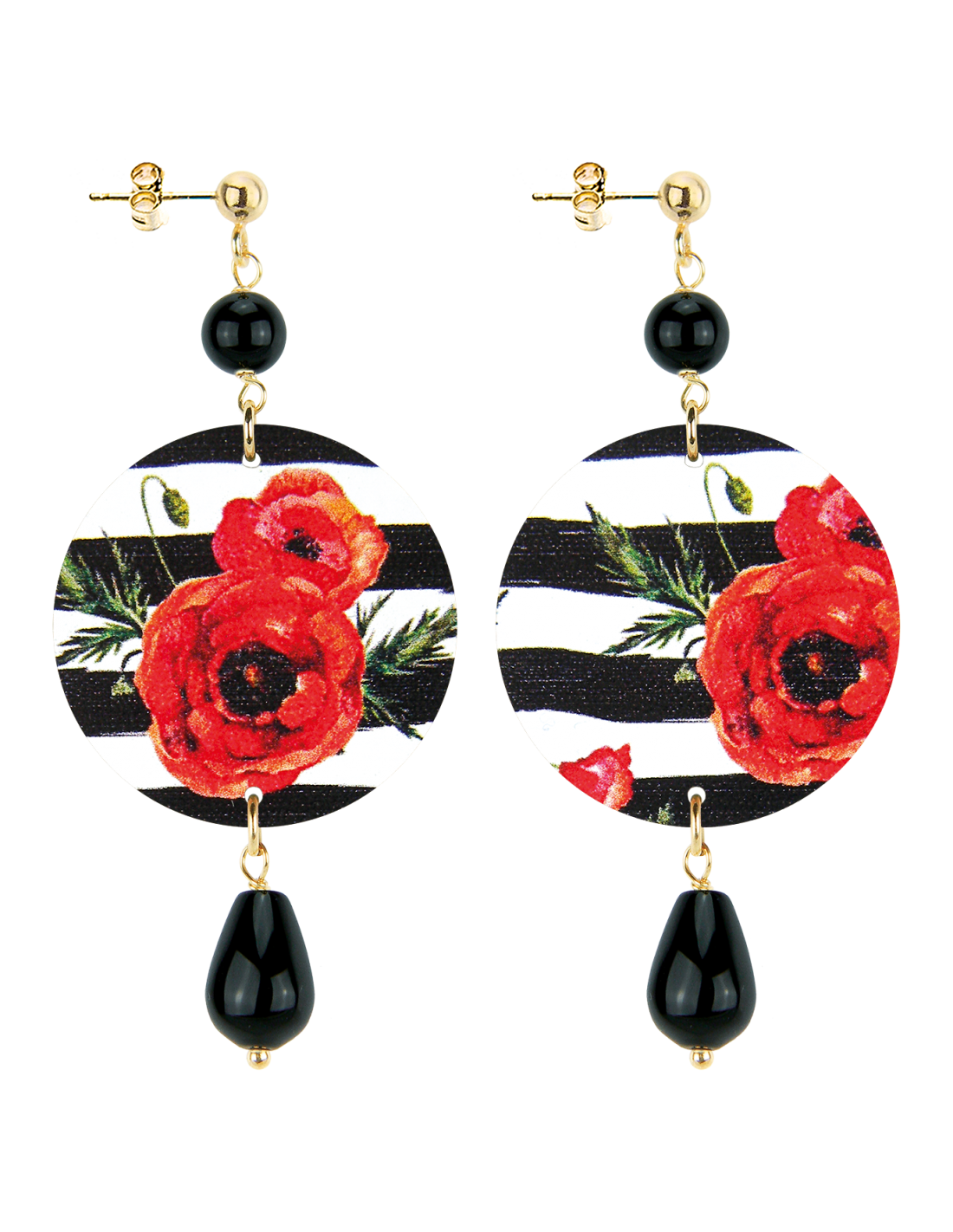 Orecchini composti da una capsula piatta stampata. Elementi in ottone galvanizzato oro e pietre naturali. Lunghezza 6,5 cm.