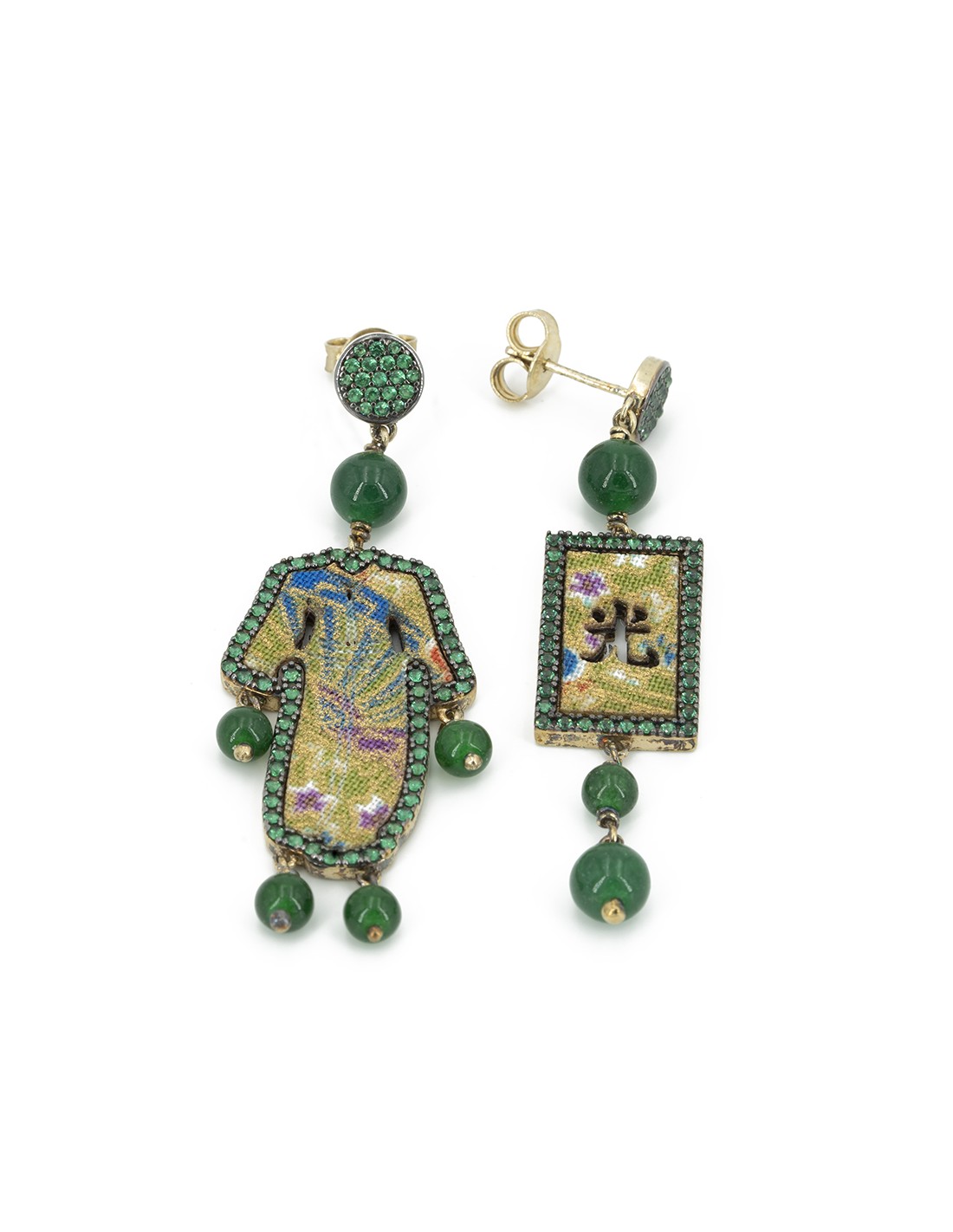 Must, 131 nano cristallo verde incassati, seta di antichi kimono, argento e pietre naturali. Lunghezza 4cm