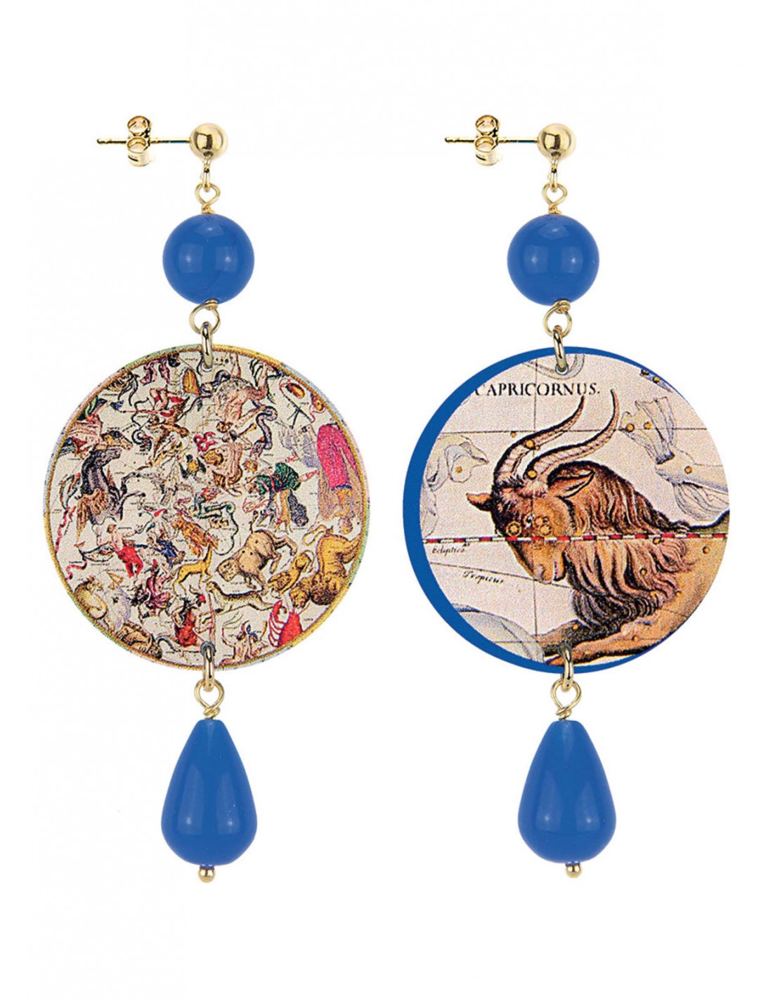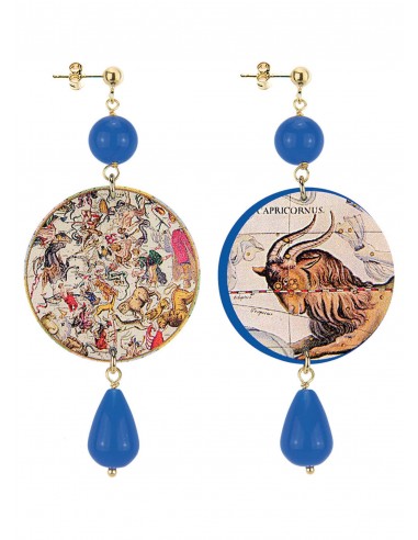 Orecchino capricorno, composto da una capsula piatta stampata. Elementi in ottone galvanizzato oro e pietre naturali. Lunghezza 8 cm.