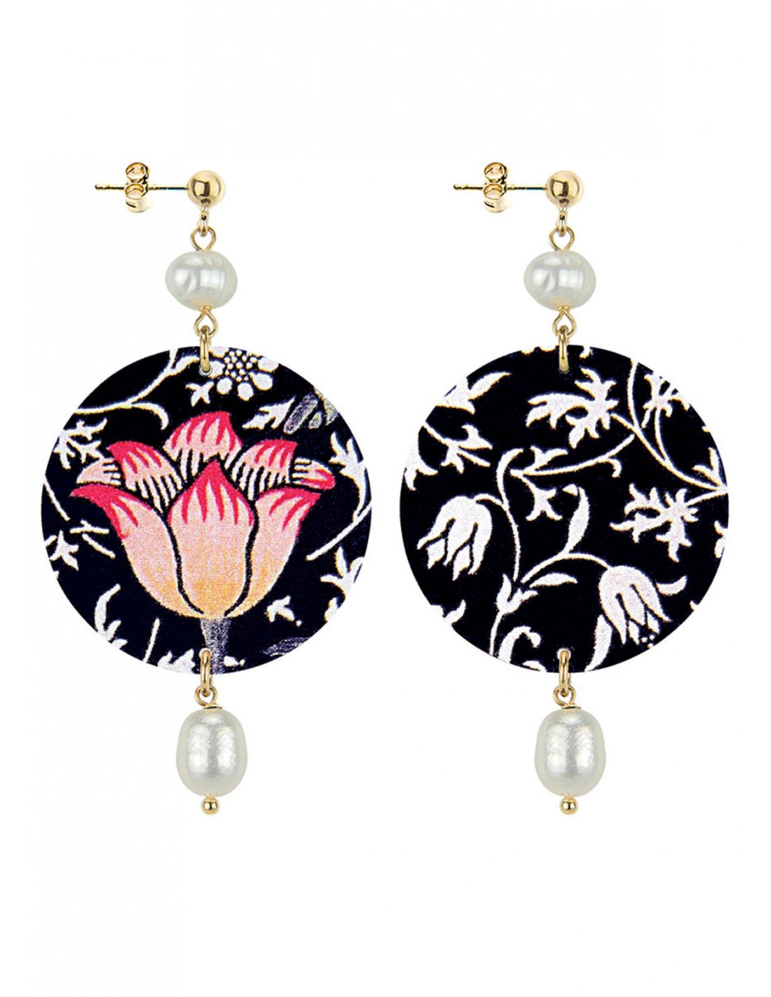 Orecchino fiore, composto da una capsula piatta stampata. Elementi in ottone galvanizzato oro e pietre naturali. Lunghezza 8 cm.