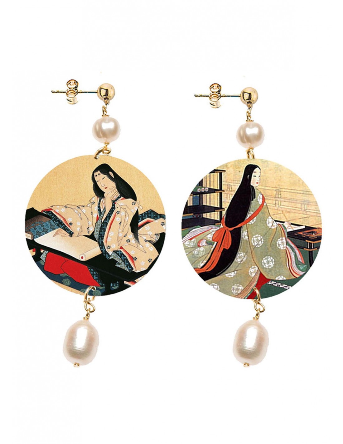Orecchino lady, composto da una capsula piatta stampata. Elementi in ottone galvanizzato oro e pietre naturali. Lunghezza 8 cm.