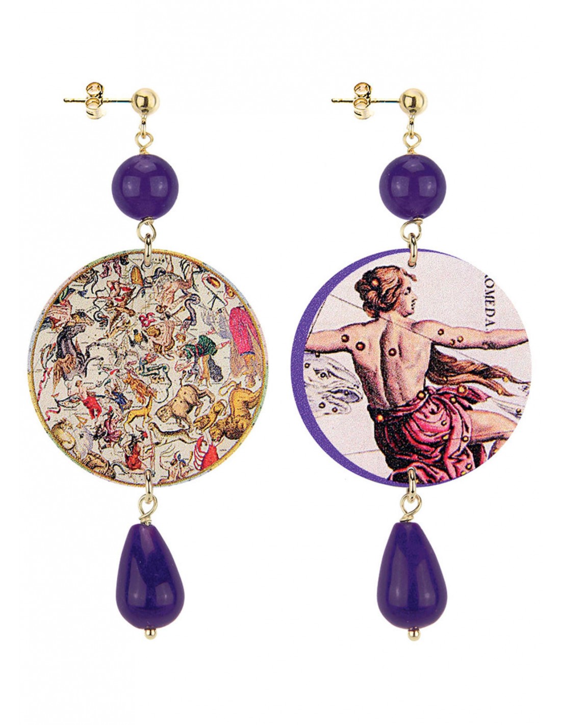 Gli orecchini della nuova collezione The Circle sono realizzati con capsule piatte stampate su banda stagnata, montati in ottone galvanizzato oro e pietre naturali. L’asimmetria è data dalle diverse immagini impresse nella capsula.
