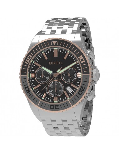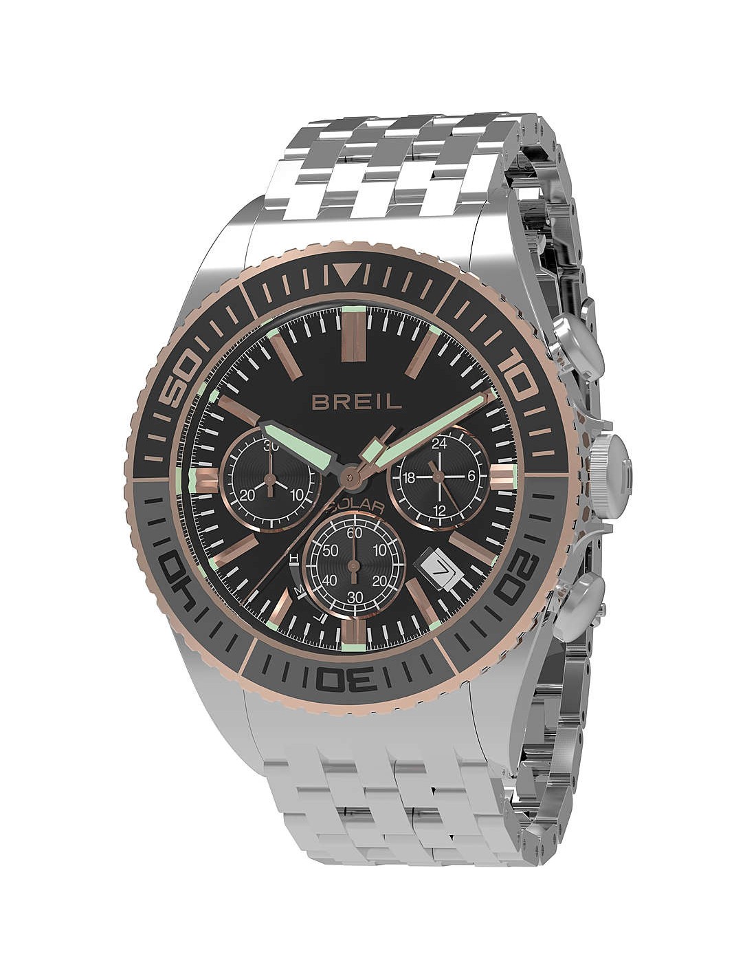 Orologio Cronografo Da Uomo Di Breil Della Collezione Manta 1970. Orologio Con Cassa Del Diametro Di 44 Mm In Acciaio, Lunetta Nera E Grigia, Quadrante Nero E Vetro Minerale. Datario Con Lente D'Ingrandimento, Indici In Ip Rose Sfere Con Luminous, Bracciale In Acciaio E Chiusura Con Pulsanti. Orologio Con Movimento Solar Vr42 E Resistenza All'Acqua Di 20 Atm.
