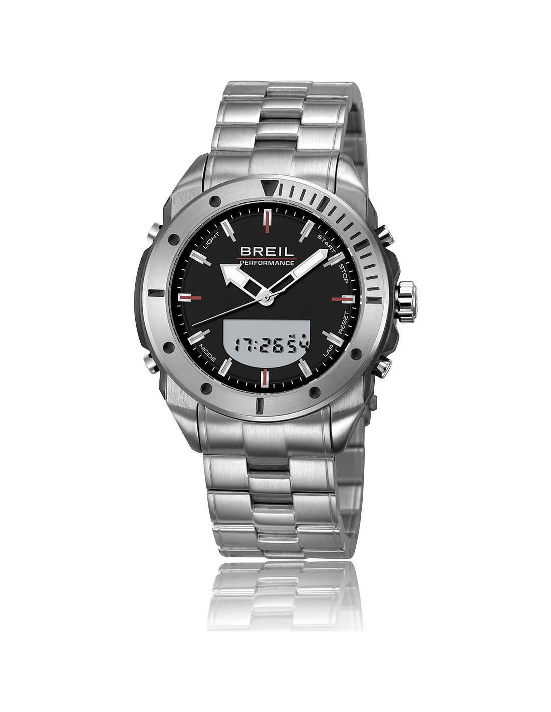 Orologio Breil, Collezione SPORTSIDE, Anadigit uomo 45mm di dimensioni di Cassa, nero, Movimento anadigit QG230+203A. Cassa in acciaio satinato con laterali in acciaio IP antracite: 45mm. Lunetta in acciaio satinato con dettagli neri. Quadrante nero con dettagli silver, bianchi e rossi. Display ad ore 6. Sfere con luminous. Vetro minerale. W.R. 10 atm. Bracciale in acciaio satinato. Chiusura diver.