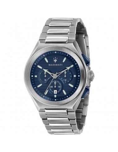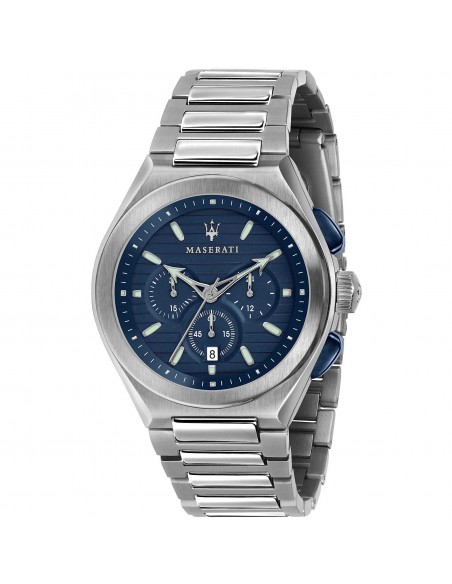 Orologio Cronografo Da Uomo Di Maserati Della Collezione Triconic. Orologio Con Cassa In Acciaio Spazzolato E Raffinato Della Dimensione Di 47, 7X43Mm E Quadrante Di Colore Blue Con Datario. Cinturino In Acciaio Di Colore Argento Con Box Buckle With Pushers. Resistenza All'Acqua Di 10 Atm. Vetro Minerale. Movimento Mvt. Js25 Chr Data Pos. 6 H. La Referenza R8873639001