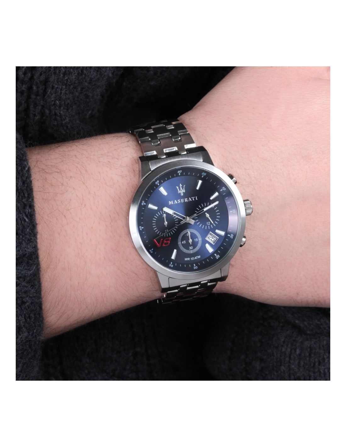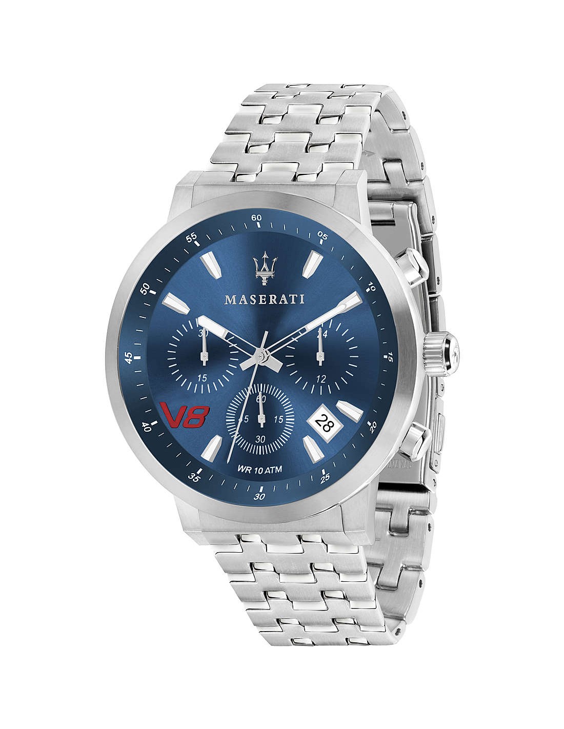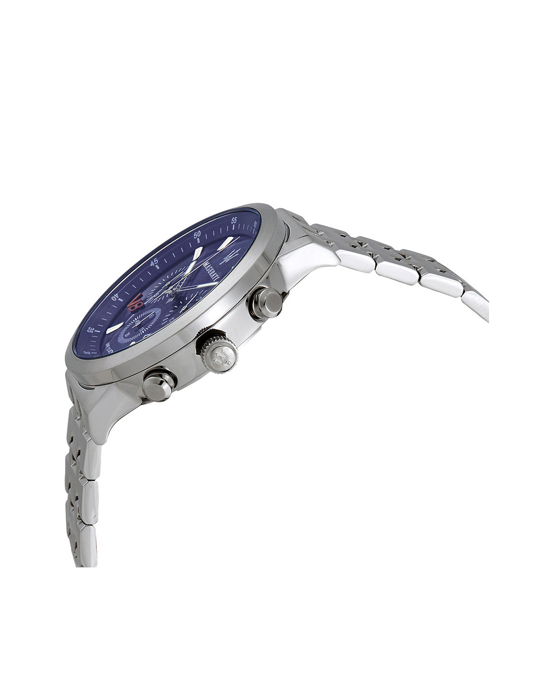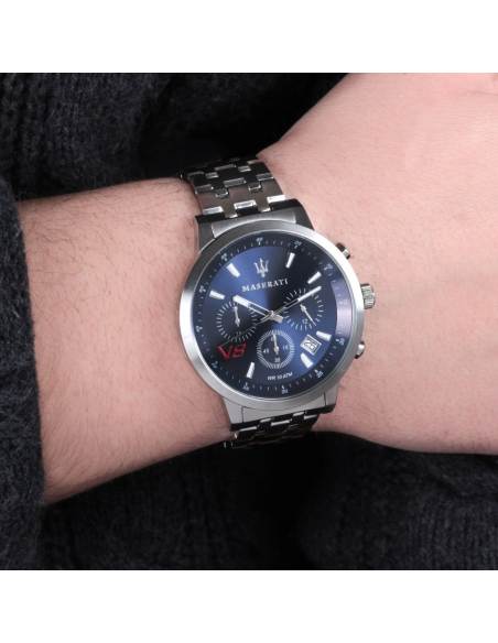Orologio cronografo uomo Maserati collezione Gt. Modello con cassa in acciaio lucido della dimensione di 50,8x44mm, quadrante di colore sunray blu e vetro minerale. Il cinturino è in acciaio con chiusura deployant. Orologio con movimento Vr32 Date 4,5H,Aig1 Whit B/G Blk Num. Resistenza all'acqua 10 atm. La referenza è R8873134002.