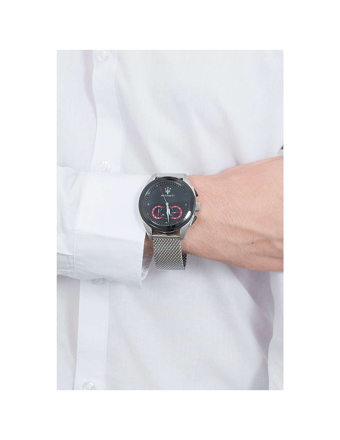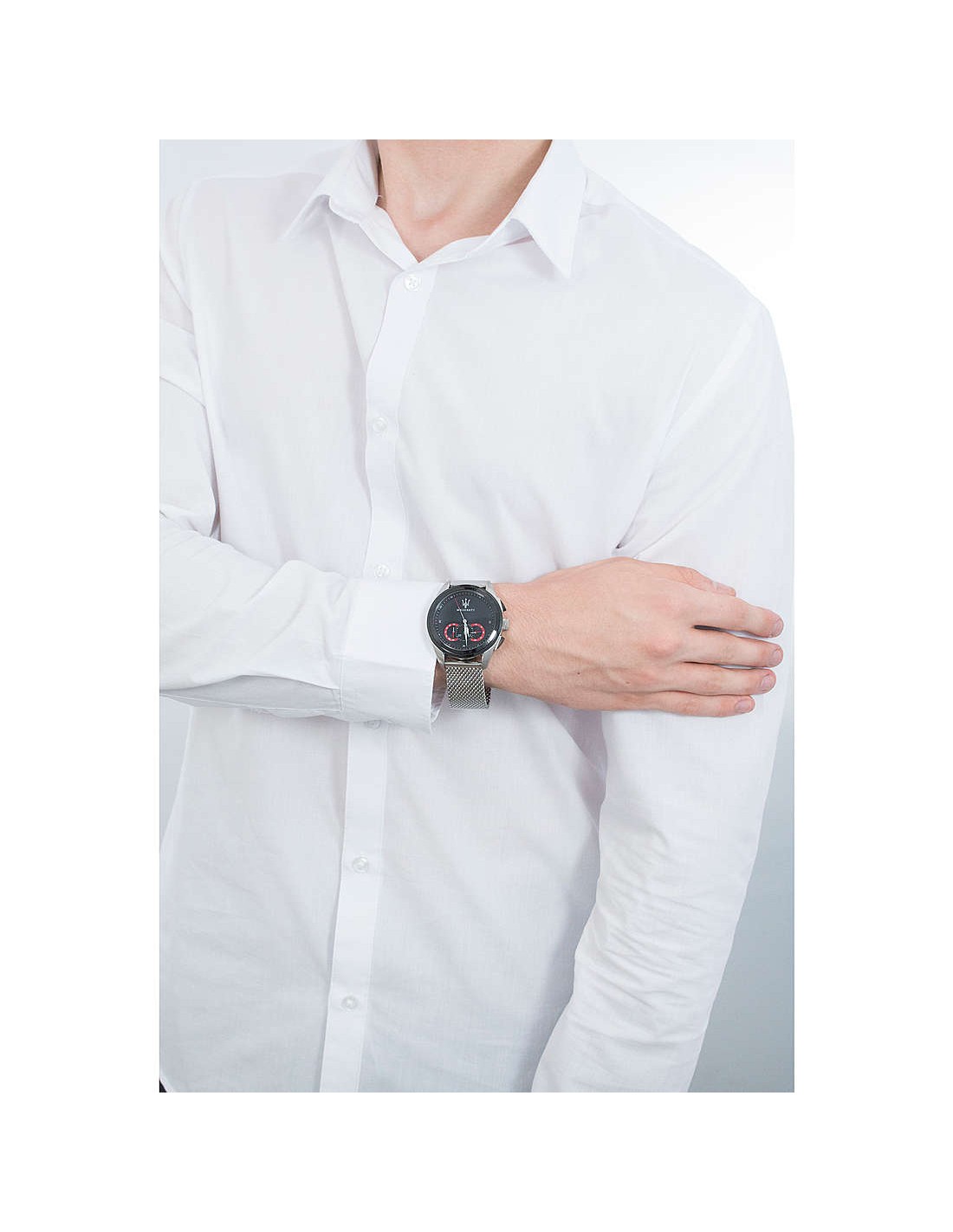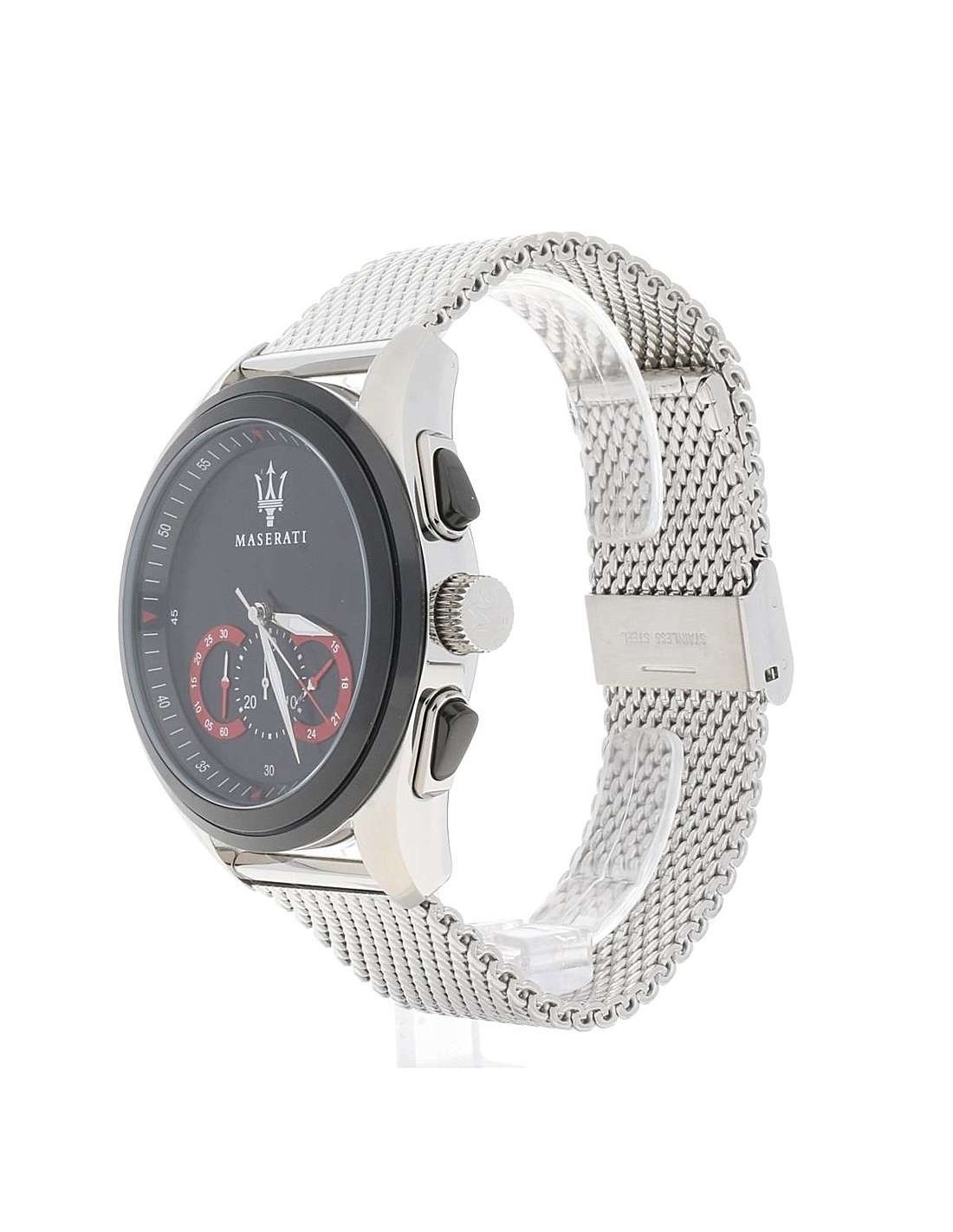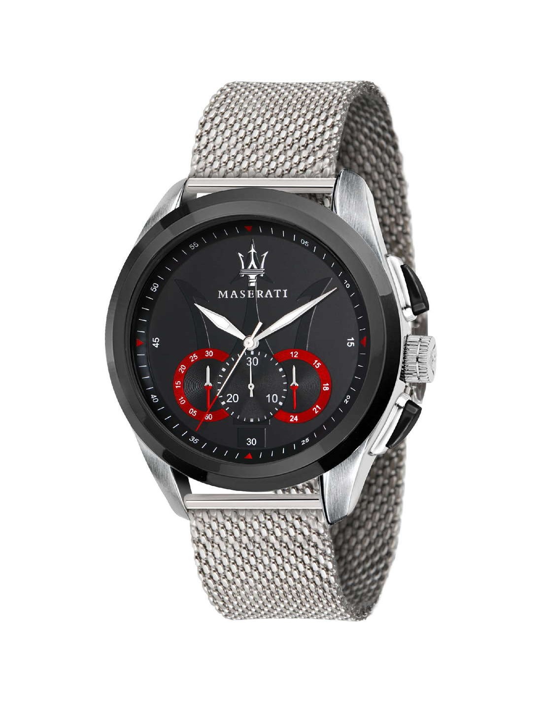 Orologio cronografo uomo Maserati collezione Traguardo. Modello con cassa in acciaio satinato, diametro 45 mm e delle dimensioni di 55 X 45 mm. Il quadrante è di colore nero e rosso con vetro minerale e cinturino in acciaio con maglia milanese di colore acciaio con fibbia deployante. Orologio caratterizzato dalle funzioni: cronografo, resistenza all'Acqua 10 Atm. La referenza è R8873612005