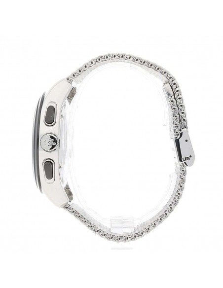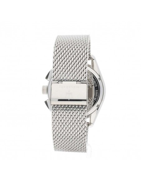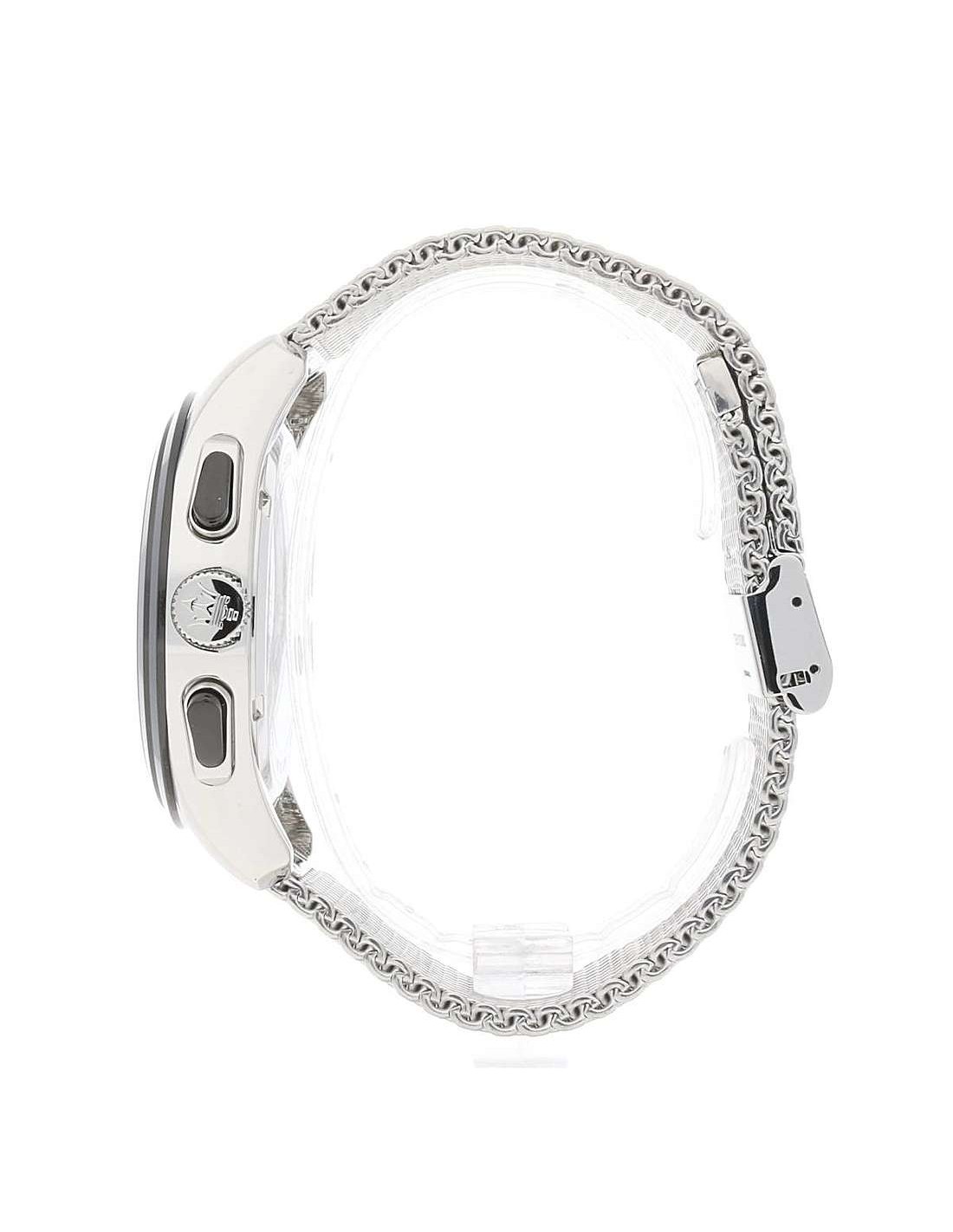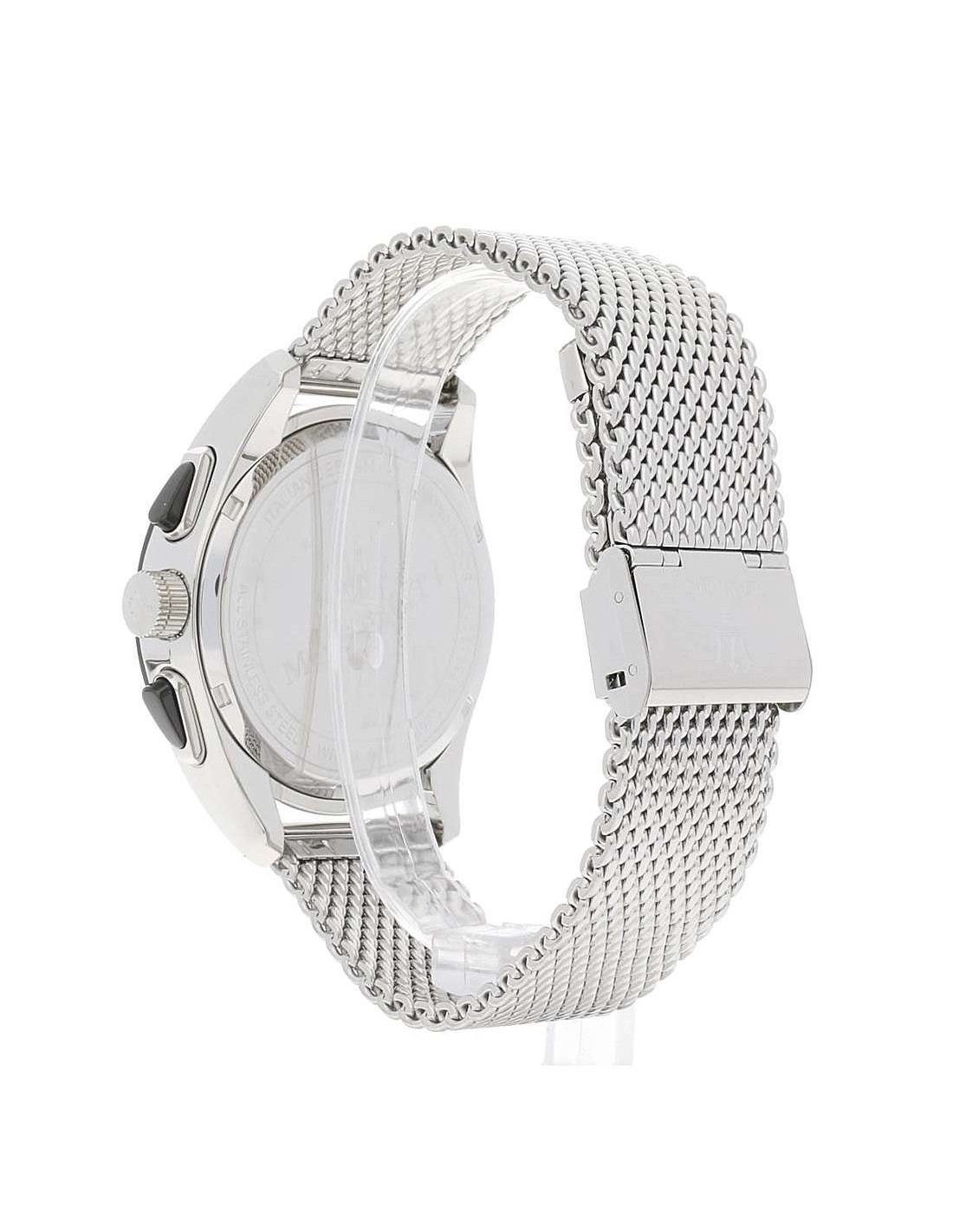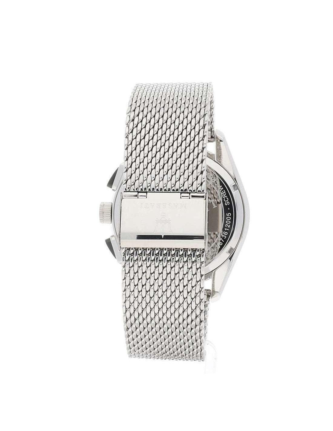 Orologio cronografo uomo Maserati collezione Traguardo. Modello con cassa in acciaio satinato, diametro 45 mm e delle dimensioni di 55 X 45 mm. Il quadrante è di colore nero e rosso con vetro minerale e cinturino in acciaio con maglia milanese di colore acciaio con fibbia deployante. Orologio caratterizzato dalle funzioni: cronografo, resistenza all'Acqua 10 Atm. La referenza è R8873612005