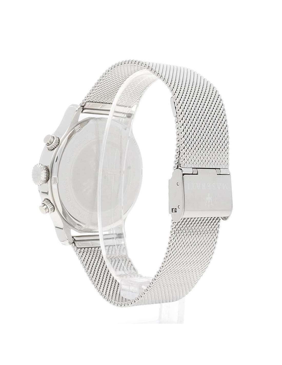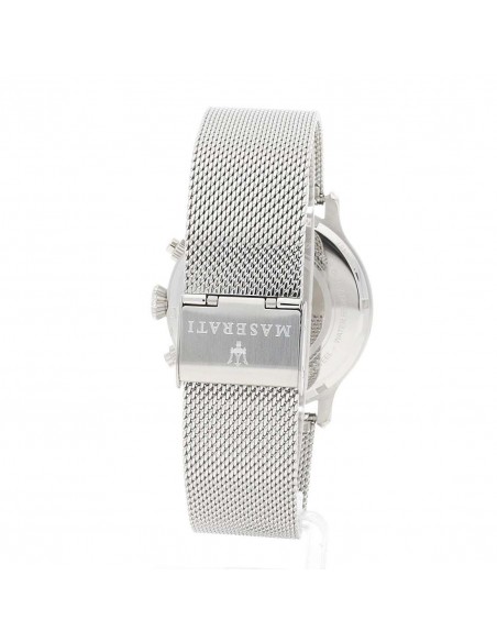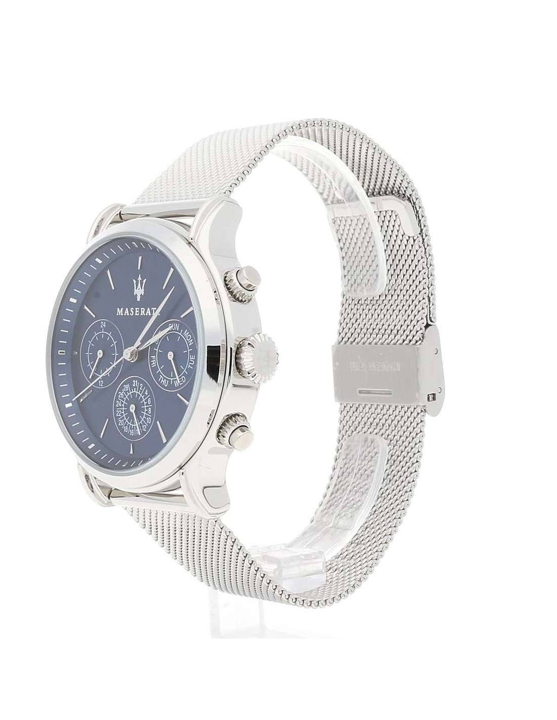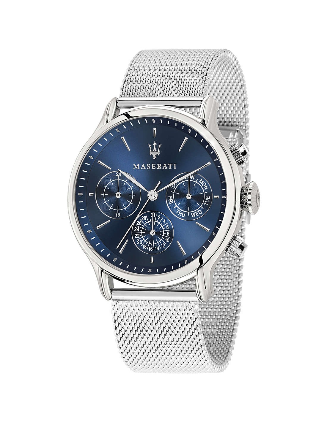Orologio multifunzione uomo Maserati collezione Epoca. Modello realizzato in acciaio. Cassa in acciaio con finitura lucida e diametro di 48x42mm, quadrante sunray blu e vetro minerale. Il bracciale maglia milanese è in acciaio con clip and hook. Resistenza all'acqua 10atm. la referenza è R8853118013.