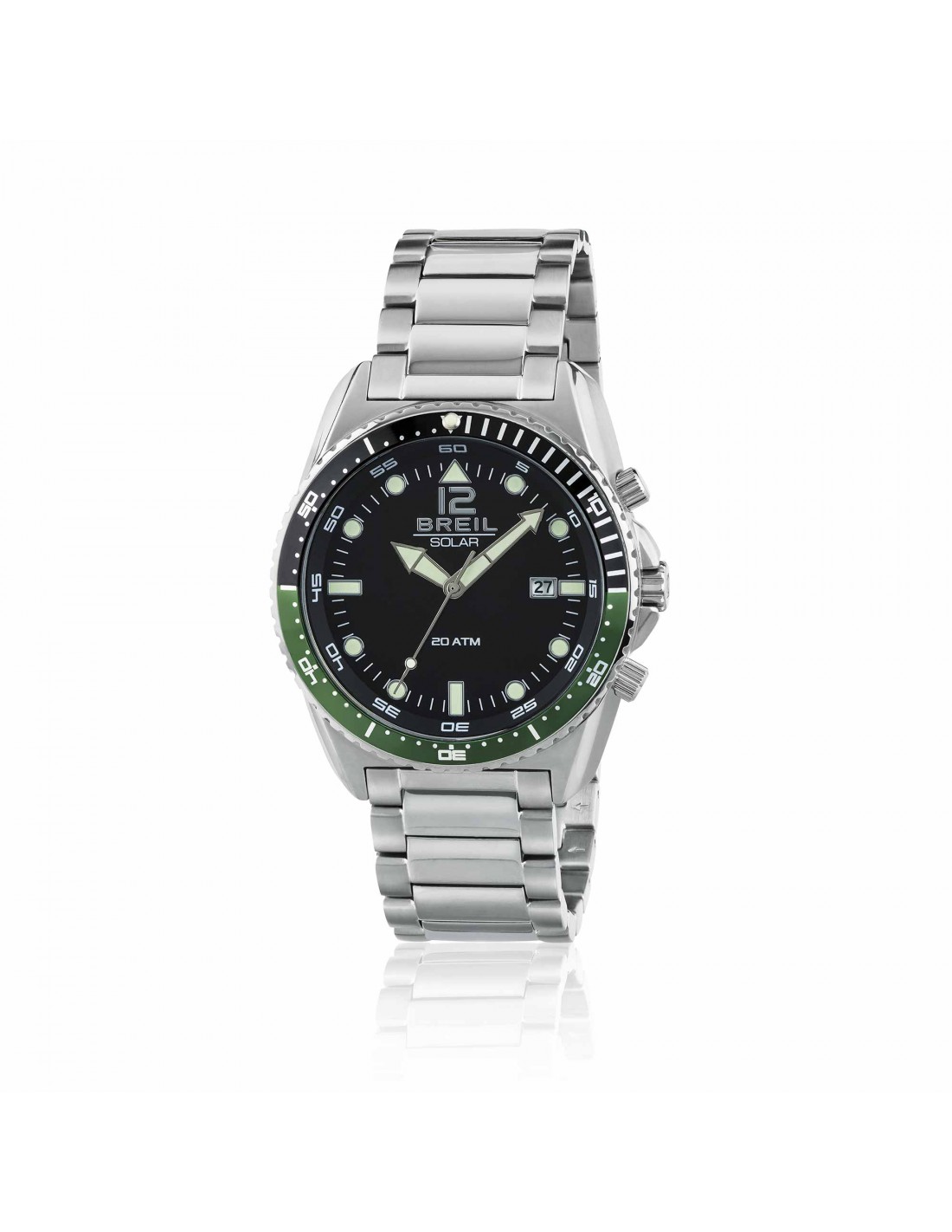 SOLO TEMPO SUBACQUEO SOLARE 43mm.Movimento Epson solar VS42.Cassa in acciaio 43mm.Sfere con luminous.Datario.Quadrante nero.Ghiera girevole unidirezionale nera e verde.Vetro minerale.W.R. 20 atm.Bracciale in acciaio.Chiusura diver con pulsanti e fermaglio di sicurezza