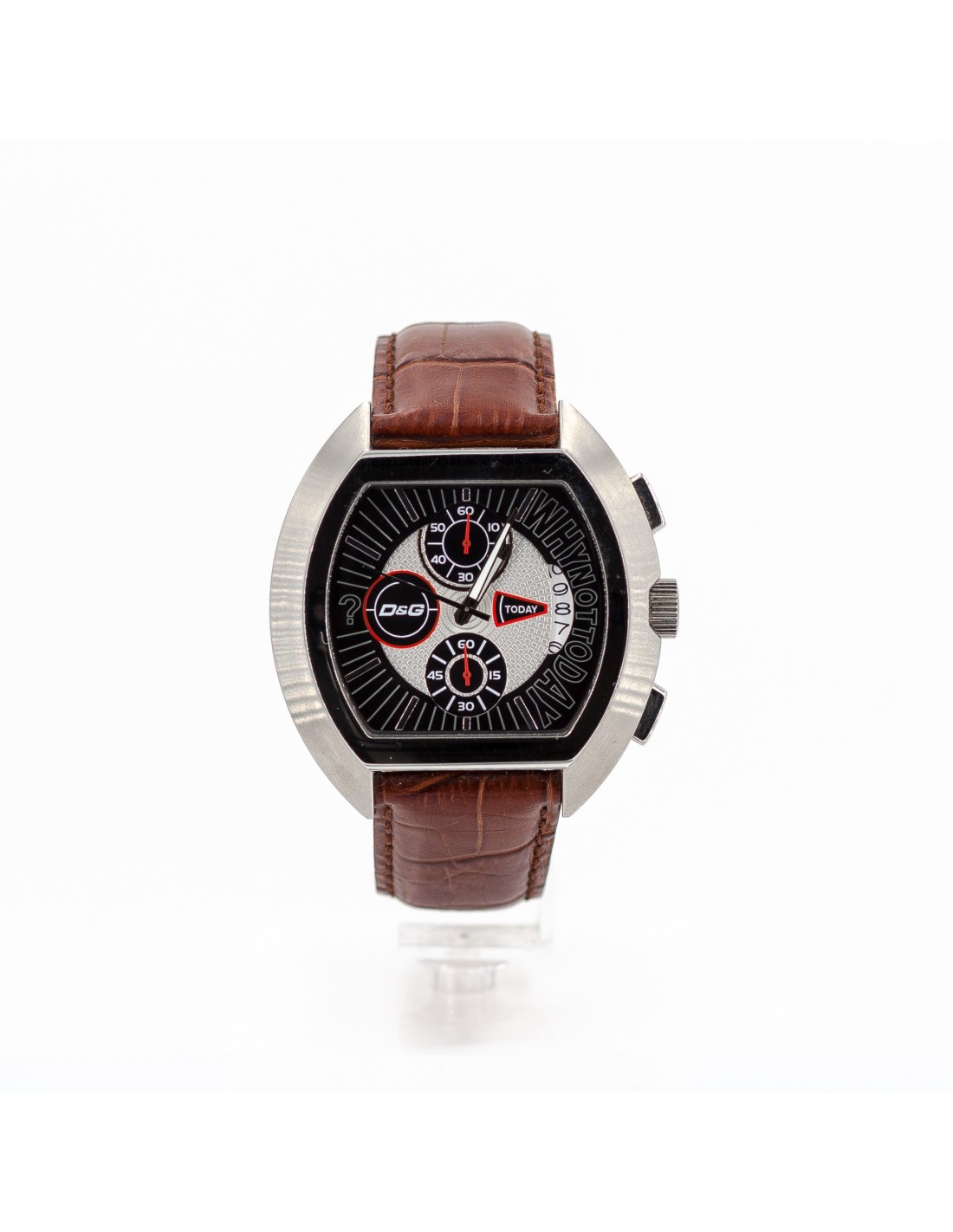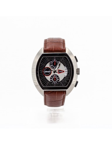 Orologio al quarzo con cronografo e datario,lancette luminose al buoi, cassa in acciaio mm 45, sfondo marrone, cinturino in pelle marrone, fondo cassa in acciaio a pressione, 5 atm WR.