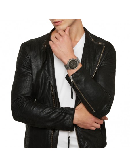 Il cronografo da uomo New One è caratterizzato da una linea morbida e avvolgente. Il bracciale ha una costruzione originale, esaltata dall'utilizzo dell'acciaio lucido, con sezione centrale satinata. In questa versione è presentato in color gun, ripreso sia nella cassa e nel bracciale integrati, sia nel quadrante con contatori ton sur ton. Il contrasto tra linee e curve conferisce un design contemporaneo e metropolitano.