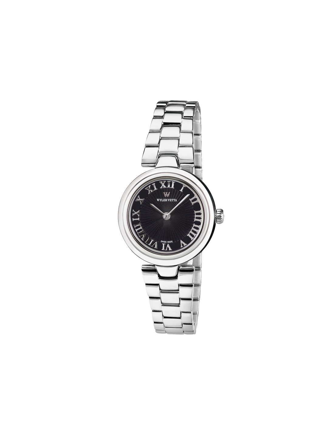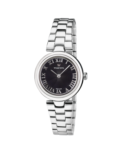 CASSA In acciaio lucido con dettagli satinati Ø 28 MM, BRACCIALE In acciaio, MOVIMENTO Al quarzo, solo tempo,Ronda Cal. 762, CORONA In acciaio, personalizzata, WR 5 ATM, CHIUSURA A scomparsa con pulsanti di sicurezza, personalizzata, QUADRANTE Nero con finitura microbillete fondo guilloché con motivoa raggiera, ore romane applicate, FONDO In acciaio fissato con 4 viti, VETRO Zaffiro bombato, WV0028.