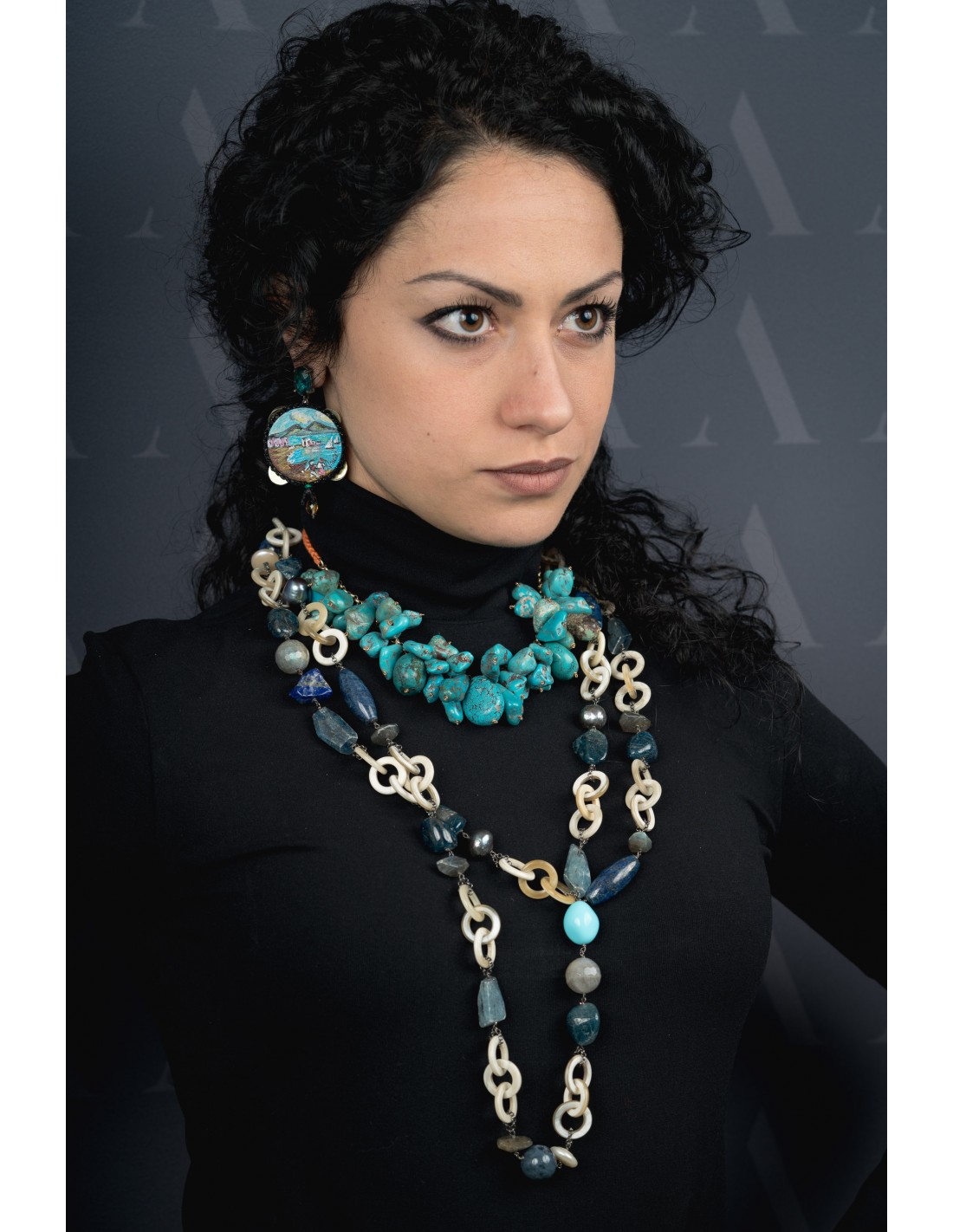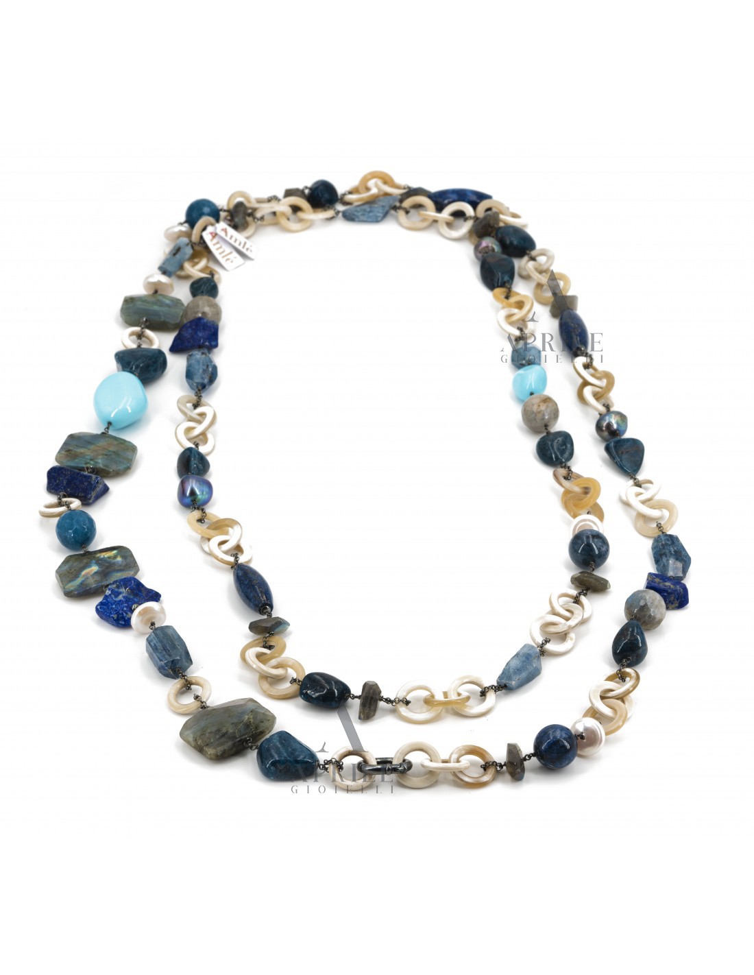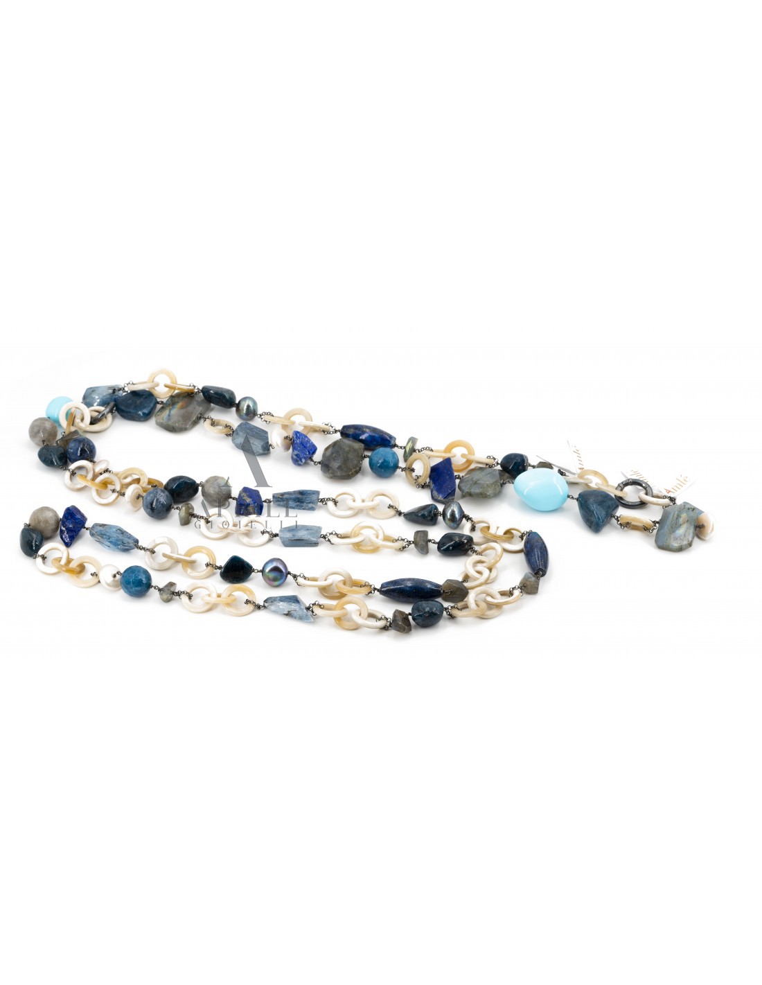 Collana Amlè in Corno Sfumato, Argento (925), Pietre e Perle Naturali. Lughezza totale 108cm regolabile. Utilizzabile a doppio giro o monogiro.