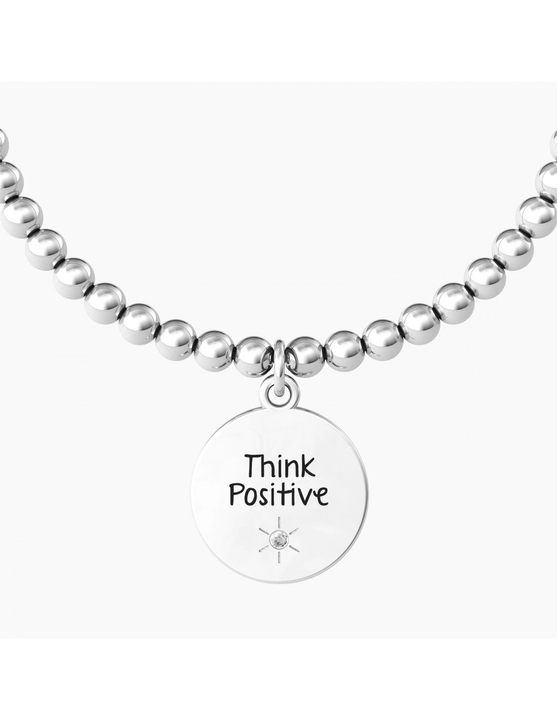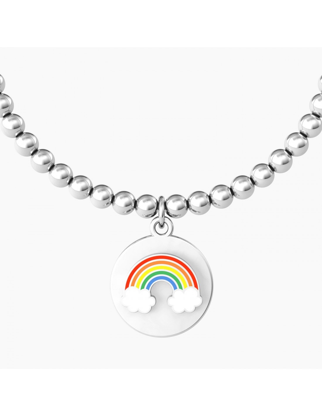 Bracciale elastico con sfere in acciaio e ciondolo satinato tondo con arcobaleno in smalto colorato e cristallo.