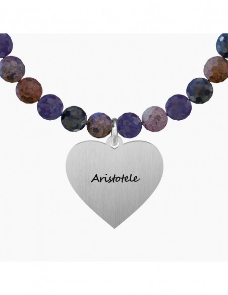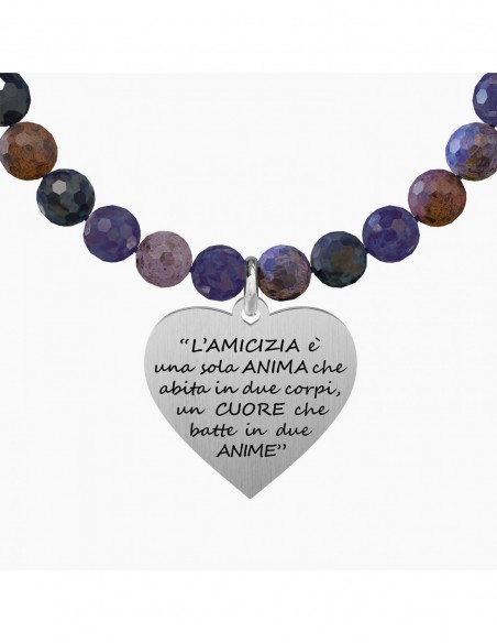 "L'amicizia  una sola anima che abita in due corpi, un cuore che batte in due anime". - Aristotele - Bracciale elastico con sfere sfaccettate agata multicolor blu e ciondolo in acciaio satinato a cuore.