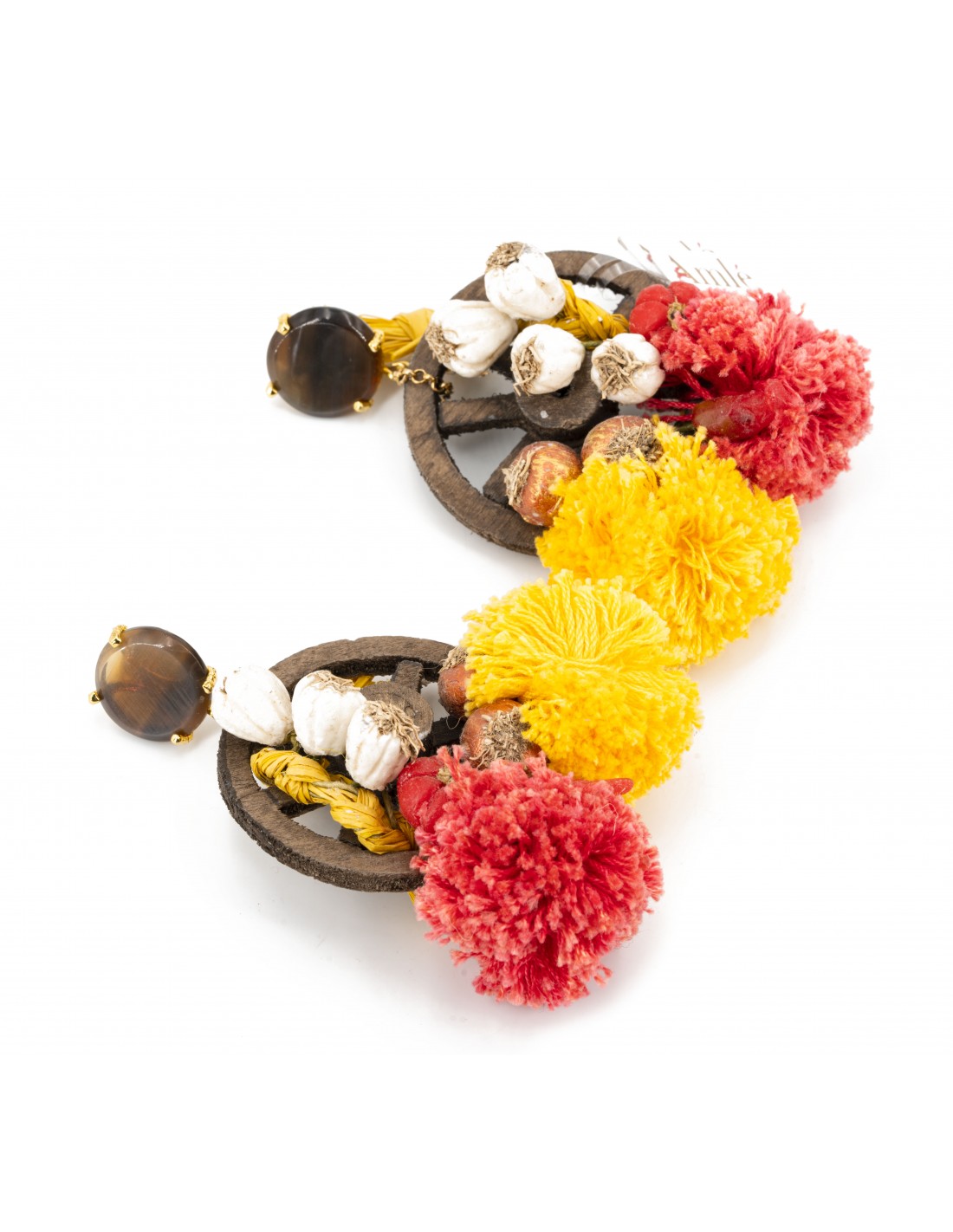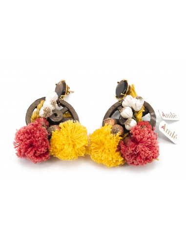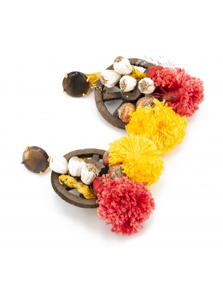 Orecchini Amlè in Legno, Pietre Naturali, Argento (925) dorato, Pendenti di Paglietta e Pon Pon cotonati.  Chiusura a Perno con Farfallina.