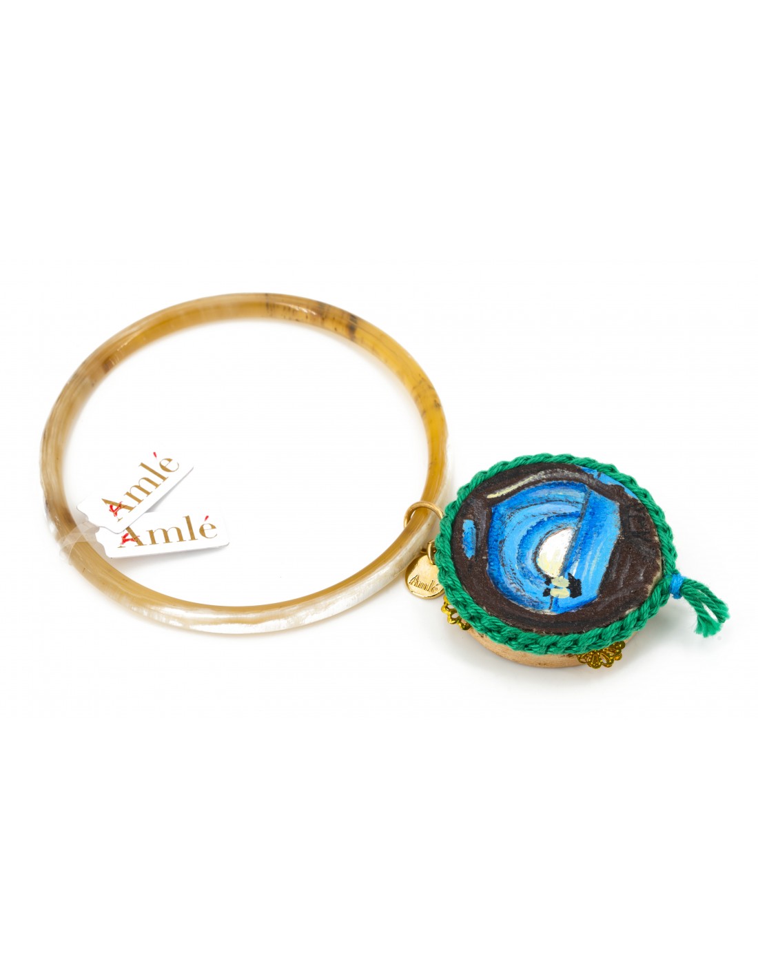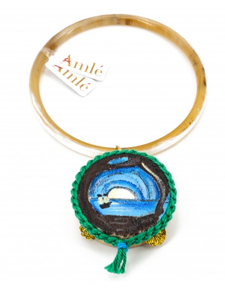 Bracciale Amlè in Corno Sfumato con Tamburello in Legno, Argento e Pelle Decorato a Mano.